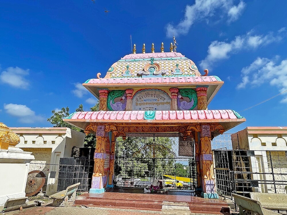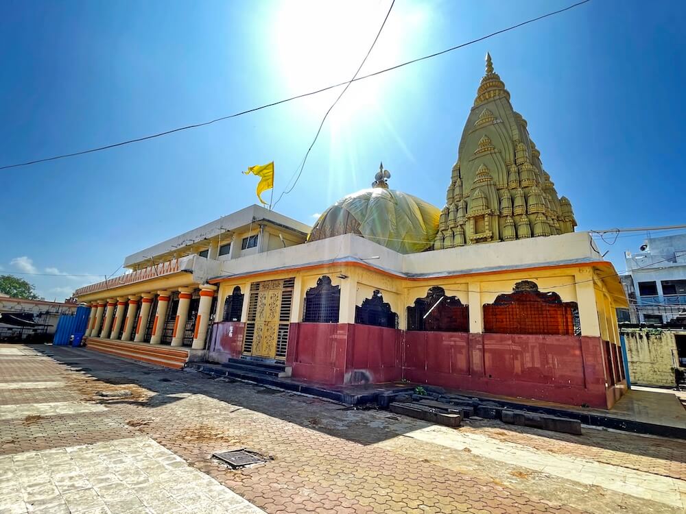 नांदेड महामार्गावरील मालेगावकडे जाणाऱ्या रस्त्यावर मंदिराची भव्य दुमजली स्वागतकमान आहे. कमानीच्या छतावर घुमटाकार शिखर व त्यावर कळस आहे. मंदिरासमोर प्रशस्त मैदान आहे, जेथे येथील प्रसिद्ध यात्रा भरते. मंदिरास भक्कम आवारभिंत आहे. त्यात पूर्व, दक्षिण व उत्तर दिशेला महाद्वारे आहेत. पूर्व दिशेच्या मुख्य महाद्वारात चार गोलाकार नक्षीदार स्तंभ आहेत. त्यावरील सज्जावर मधोमध आडव्या बांधणीचे शिखर व त्याच्या चारही कोनांवर उभी शिखरे आहेत. उत्तर महाद्वार दुमजली आहे व त्याच्या वरील मजल्यावर नगारखाना आहे. महाद्वाराच्या छतावर आडव्या बांधणीचे शिखर आहे. या शिखरावर रांगेत पाच कळस आहेत. येथून आत आल्यावर मंदिराच्या प्रांगणात प्रवेश होतो.