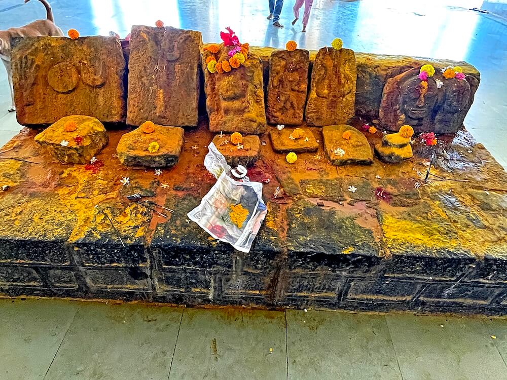 भामंडपात एका चौथऱ्यावर काही प्राचीन पाषाण मूर्ती आहेत. यातील दोन चेहरे असलेले शिल्प मणी व मल्ल या असुरांचे असल्याचे सांगितले जाते. पुढे प्राचीन हेमाडपंती शैलीचे दगडी बांधकाम असलेले मंदिराचे अंतराळ व गर्भगृह आहे. अंतराळाच्या द्वारशाखांवर खालील बाजूस द्वारपाल शिल्पे व वर पानाफुलांची नक्षी कोरलेली आहे. ललाटबिंबावर गणपतीचे शिल्प आहे. उत्तरांगावर मध्यभागी सूर्य व दोन्ही बाजूस पद्मपुष्प नक्षी आहे. अंतराळात दोन्ही बाजूस देवकोष्ठके आहेत. उजव्या बाजूच्या देवकोष्ठकात नंदी व मारुतीची मूर्ती आणि डावीकडे विठ्ठल–रखुमाईच्या मूर्ती आहेत.
