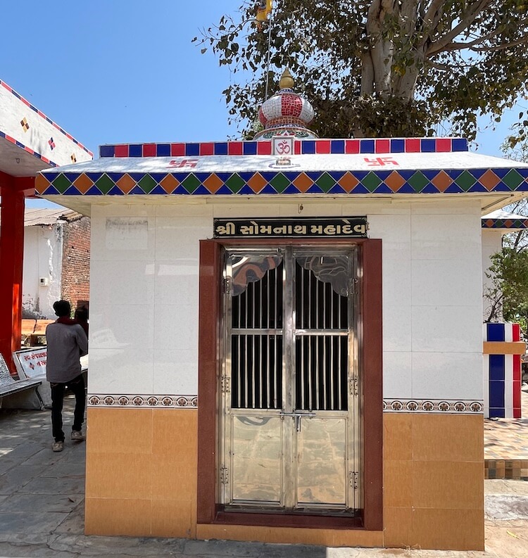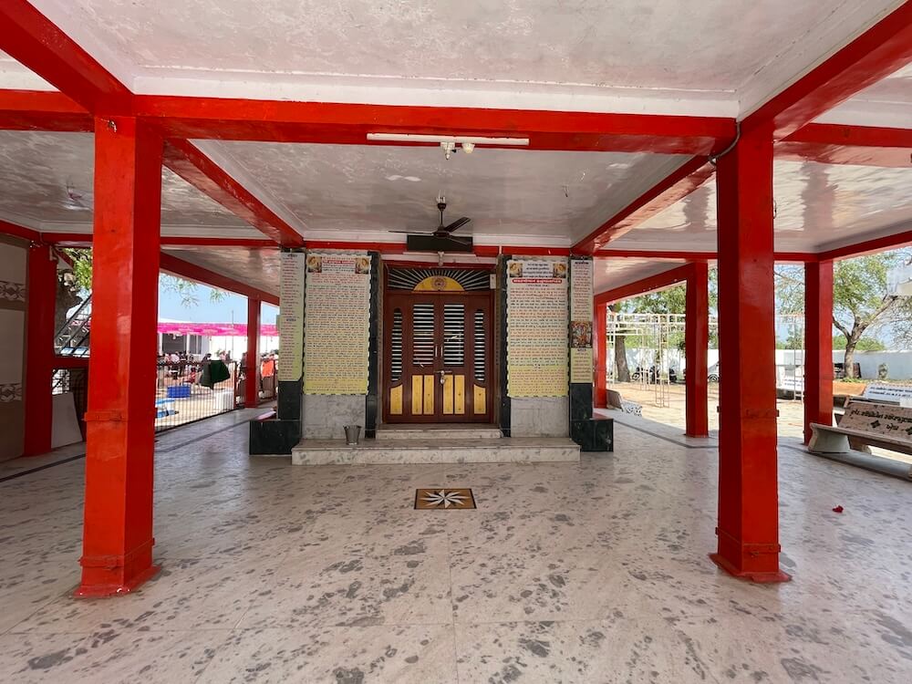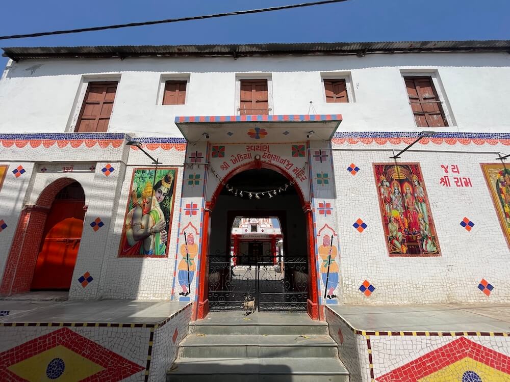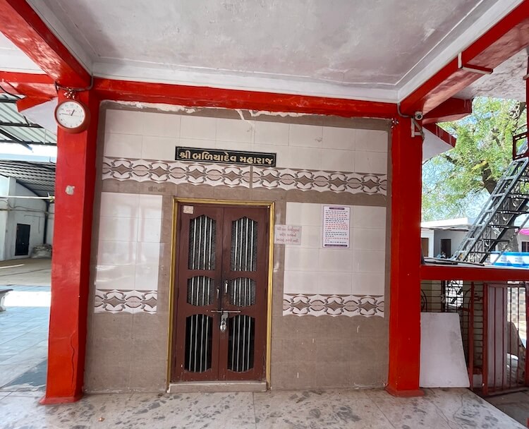 The temple is nestled in a tranquil setting on the outskirts of Kheda city, with the primary structure situated atop a hillock of moderate height known as ‘Hanuman Tekro’. A parking facility for vehicles is provided at the base. Entry to the temple courtyard is gained through a two-storeyed gateway set within the perimeter fortifications, the upper floor of which houses a ‘Nagarkhana’ (traditional drum house). The expansive courtyard is fully paved and features numerous seating arrangements for the repose of pilgrims. One section of the courtyard is graced by a ‘Tulsi-vrindavan’ (sacred basil shrine). Facing the main structure is an independent temple dedicated to Lord Mahadev, with an idol of Goddess Parvati enshrined in a niche within its rear wall. To the right of the principal shrine stands a dedicated ‘Tilak’ chamber.