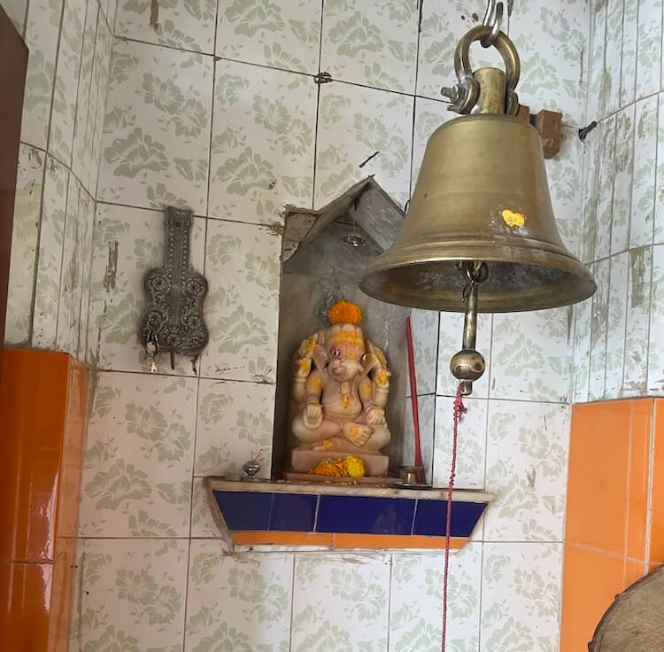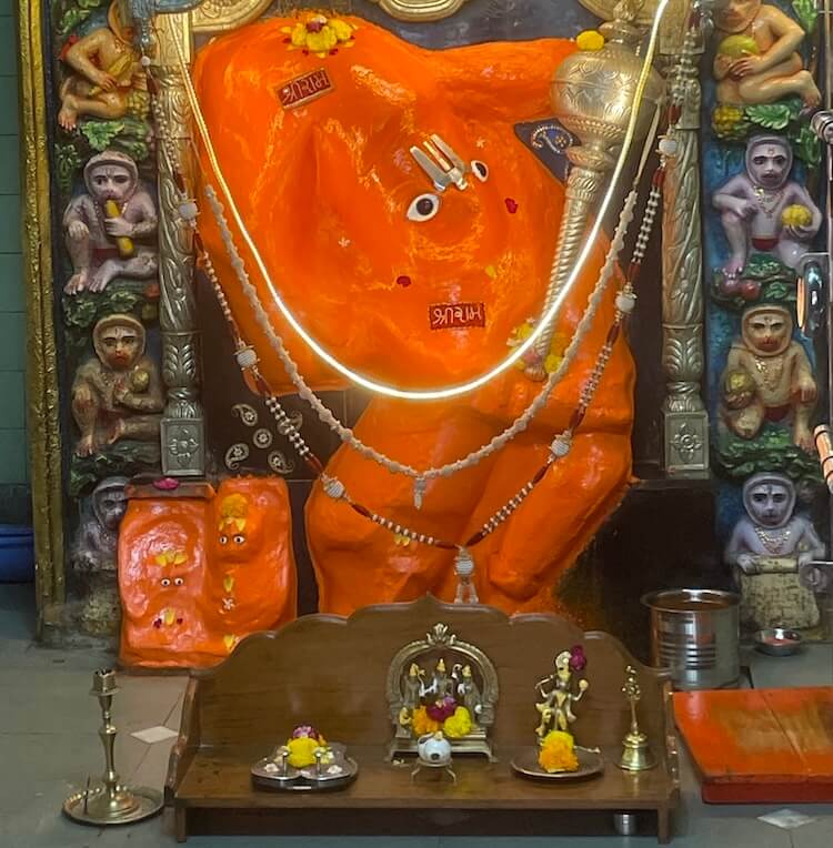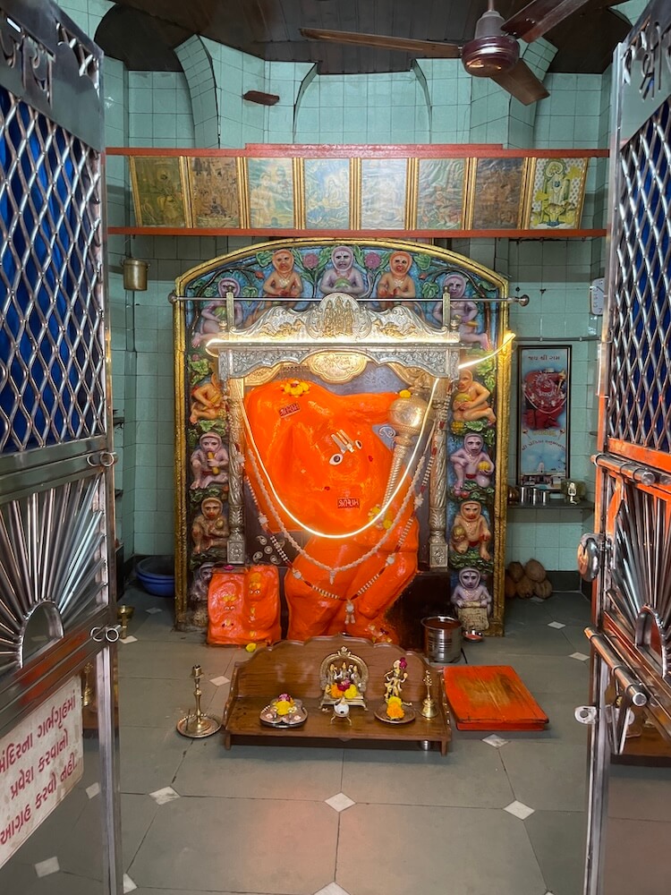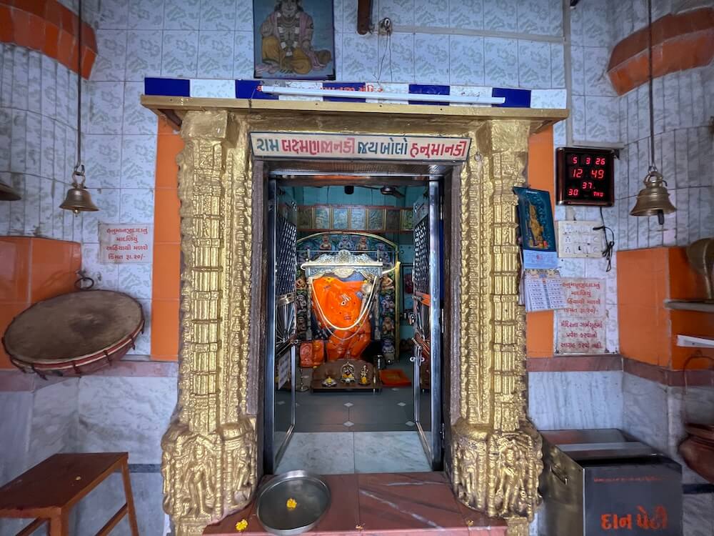 the entrance to the ‘Antaral’ is elevated above the hall floor, accessed by two steps. The lintel of this wooden-shuttered entrance is engraved with an image of the Sun. Within the vestibule, niches house idols of Lord Ganpati and other divinities. The doorframes of the sanctum sanctorum feature base carvings of Bhairav gatekeepers (Dwarpalas) and female attendants (Dwarsevikas). The frames are further embellished with intricate motifs of creepers, flowers and traditional pot-and-foliage patterns (Kumbhathar). A sculpture of Lord Ganesha graces the lintel of the sanctum. Inside, within a delicately carved silver frame (Makhar), resides the stone ‘Swayambhu’ idol of Hanuman, consecrated with vermillion. The deity, wielding a silver ‘Gada’ (mace) in one hand, is adorned with a silver crown, earrings and silver necklaces.