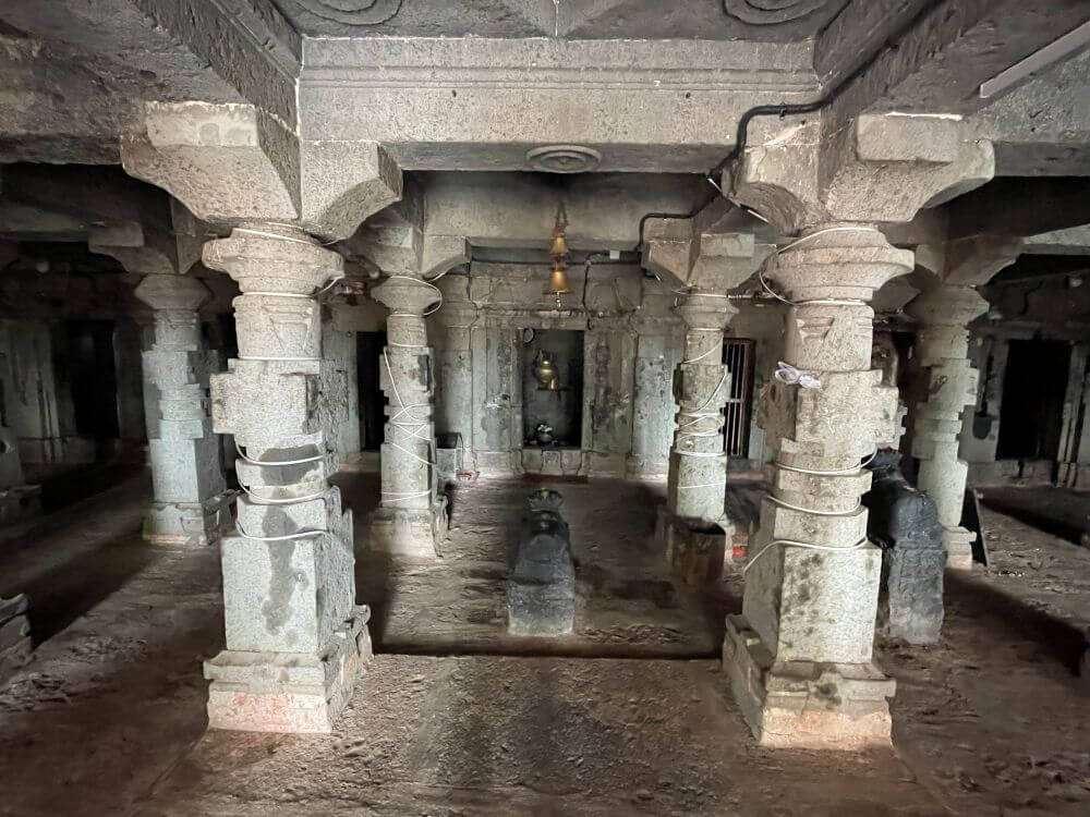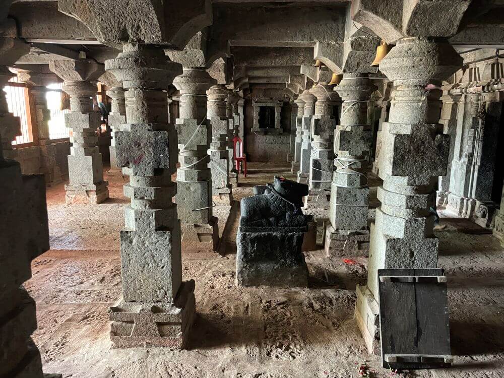 रस्त्यालगत असलेल्या या मंदिराचे प्रांगण प्रशस्त आहे. प्राचीन मंदिरासमोर अलीकडील काळात दर्शन मंडप उभारलेला आहे. दर्शनमंडपात प्रवेशद्वारावरील सुमारे दहा फूट रुंद जागा खोलगट आहे. या खोलगट जागेच्या दोन्ही बाजूला चौथऱ्यांना लागून भाविकांना बसण्यासाठी कक्षासने आहेत. सभामंडप, अंतराळ गर्भगृह अशी या मंदिराची संरचना आहे. सभामंडपात एकूण ३२ नक्षीदार स्तंभ चौकोनी स्तंभपादावर उभे आहेत. स्तंभदंडात चौकोन, षट्कोन, अष्टकोन वर्तुळ असे विविध भौमितिक आकार आहेत. सभामंडपाच्या वितानावर चक्राकार नक्षी आहे. स्तंभदंड, हस्त, तुळई यांवर विविध नक्षी कोरलेल्या आहेत. सभामंडपात मध्यभागी असलेल्या चार स्तंभांच्या मधे चौकोनी रंगशिळा आहे. प्राचीन काळी देवाच्या रंगभोगासाठी रंगशिळेवर नृत्य, गायन आदी कार्यक्रमांचे आयोजन करण्यात येत असे. सभामंडपातील दोन चौथऱ्यांवर नंदी मूर्ती आहेत. सभामंडपात देवकोष्टकांमध्ये गणपती, पार्वती आदी देवदेवतांच्या मूर्ती आहेत.