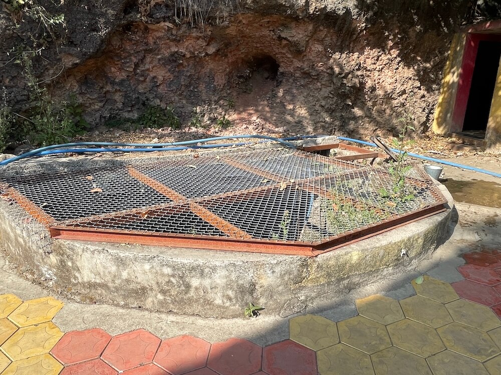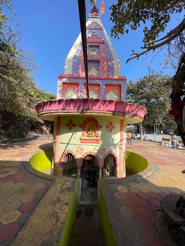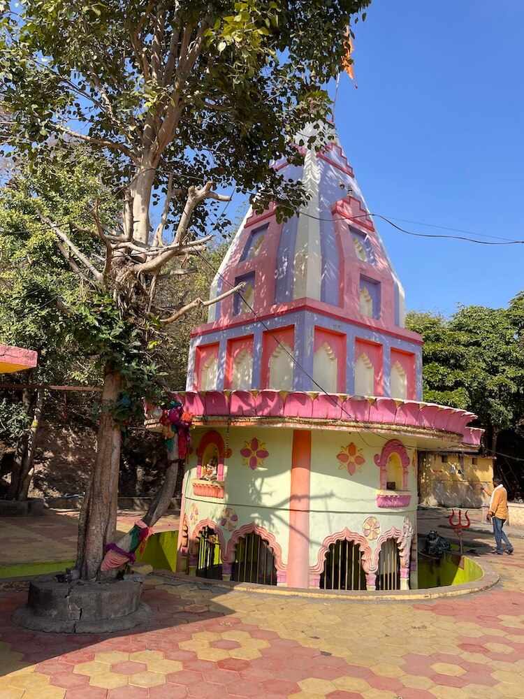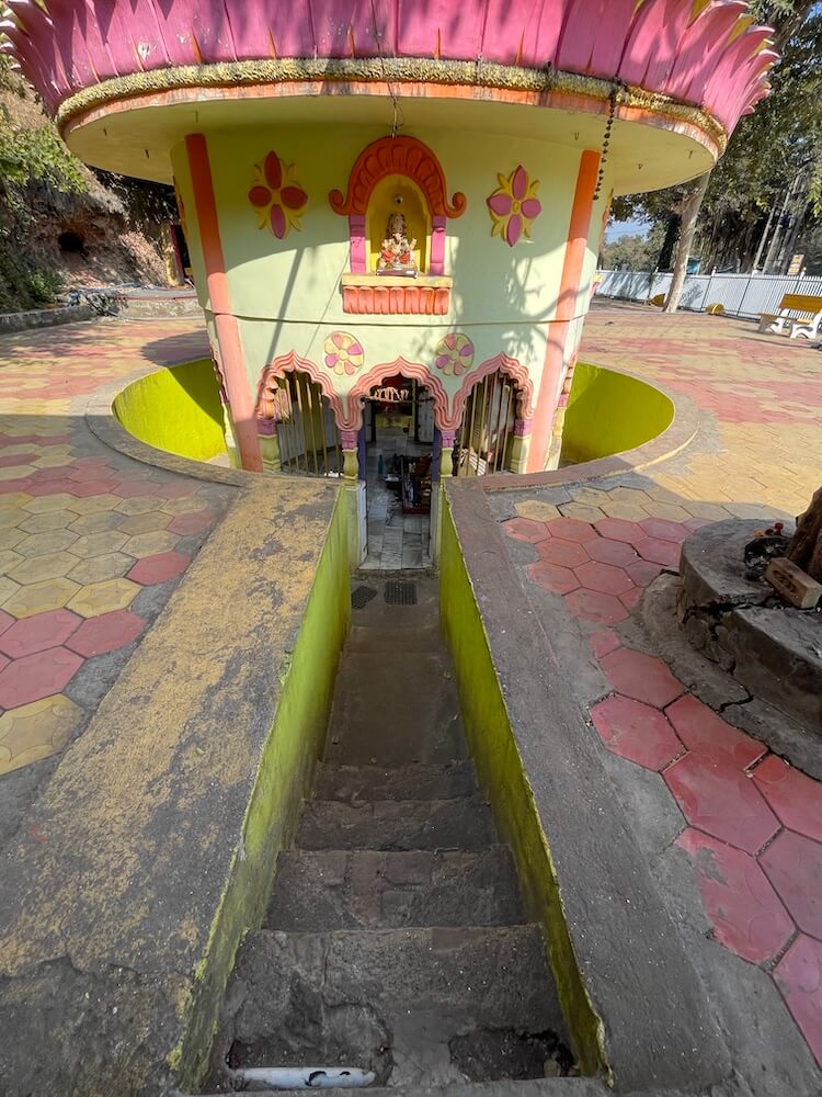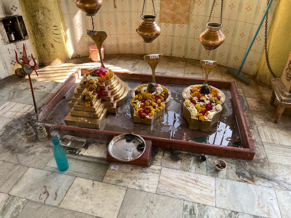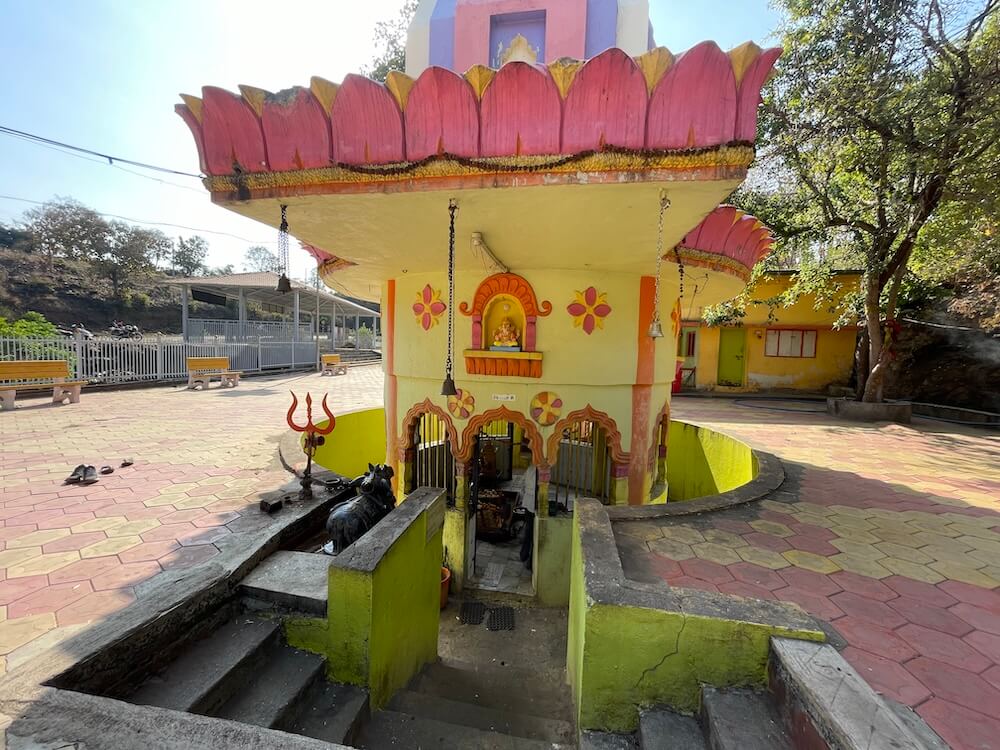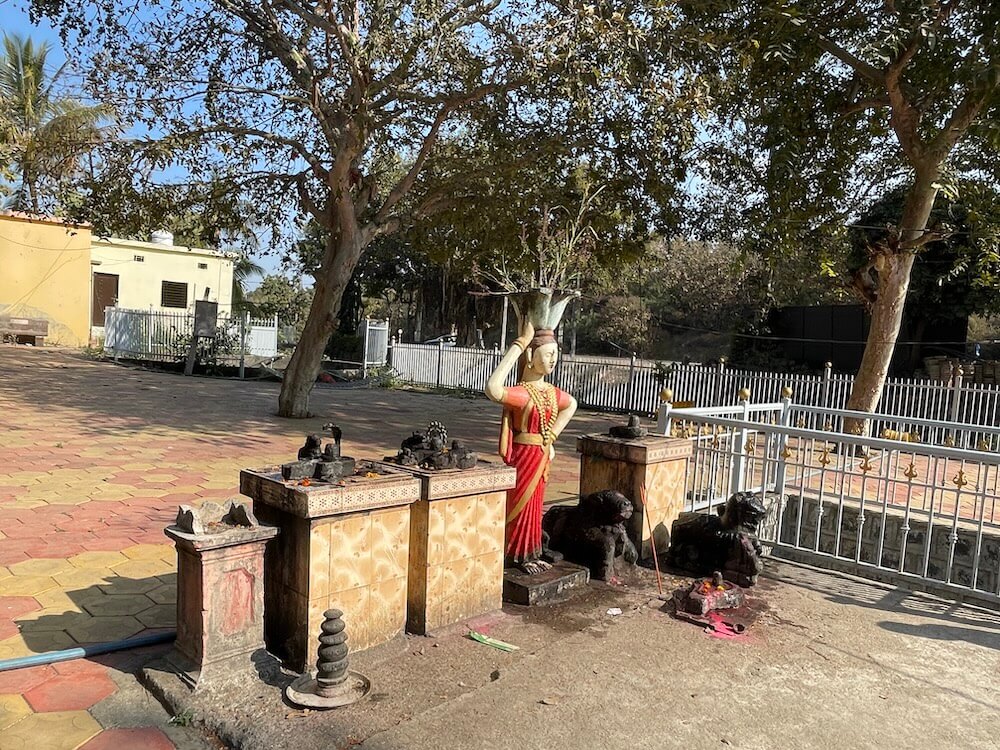 मुख्य रस्त्यापासून काही पायऱ्या उतरून महादेव मंदिराच्या प्रांगणात प्रवेश होतो. पेव्हरब्लॉकची फरसबंदी असलेल्या या प्रांगणात भाविकांना बसण्यासाठी बाकांची सुविधा आहे. मुख्य मंदिराच्या शेजारी नव्याने सभामंडप बांधलेला आहे. मूळ मंदिर हे प्रांगणापेक्षा काहीसे खोलवर असल्याने आठ पायऱ्या उतरून मंदिराच्या गर्भगृहात प्रवेश होतो. गर्भगृहाच्या प्रवेशद्वाराजवळ एक नंदी व त्याशेजारी त्रिशूळ आहे. प्रवेशद्वाराच्या उत्तरांगावर गणपतीची मूर्ती आहे. गोलाकार आकारात असलेल्या या गर्भगृहात वज्रपीठावर तीन पिंडी आहेत. यापैकी एक मोठी व इतर दोन सारख्या आकाराच्या आहेत. या तिन्ही पिंडींवर पितळी पत्र्याची आवरणे आहेत. त्यांवर नागांनी छत्र धरलेले आहेत व तिन्ही पिंडींच्या वर छताला अभिषेकपात्रे टांगलेली आहेत. या तीन पिंडी ब्रह्मा, विष्णू आणि महेश या त्रिदेवांचे प्रतीक म्हणून येथे पुजल्या जातात. या गर्भगृहाला दोन दरवाजे व बाहेरून प्रदक्षिणा मार्ग आहे. दुसऱ्या प्रवेशद्वारातून मंदिराच्या सभामंडपात प्रवेश होतो. या मंदिराच्या प्रांगणात एक कुंड व एक विहीर आहे. याशिवाय प्रांगणात समाध्यांचे तीन चौथरे व त्यावर शिवपिंडी आहेत. याशिवाय प्रांगणात अनेक प्राचीन मूर्ती, पिंडी व नंदीमूर्ती आहेत.