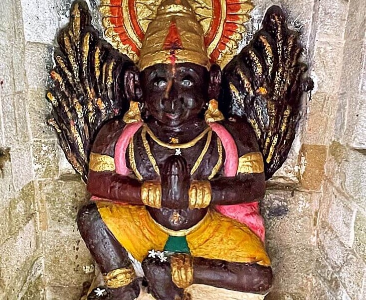 या मंदिरासमोर असलेल्या देवळीमध्ये (छोटे मंदिर) मांडी घालून बसलेली वैशिष्ट्यपूर्ण गरुड देवतेची मूर्ती आहे.