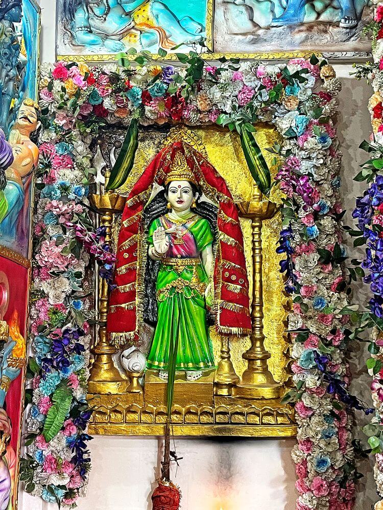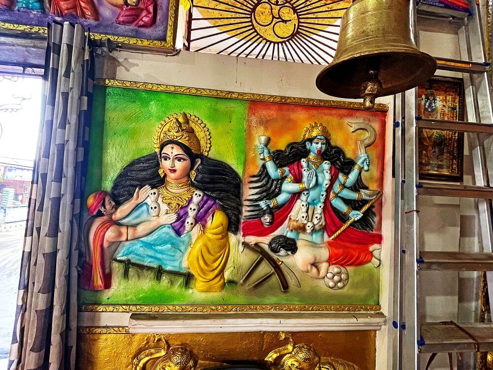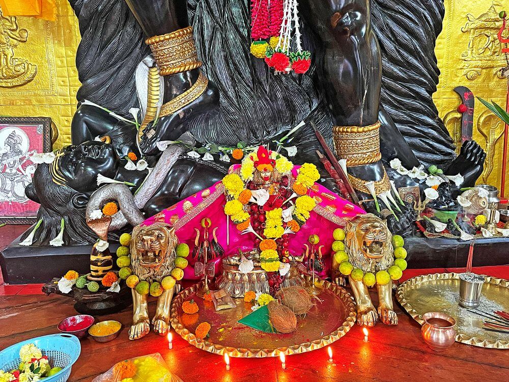 मूर्ती आणण्यापूर्वी मंदिराला नवे स्वरूप देण्यात आले. मात्र, मूर्तीचा आकार मोठा असल्याने तिला आत आणता येत नव्हते. तीन दिवस मूर्ती मंदिराबाहेरच उभी होती. तिसऱ्या दिवशी मंदिराच्या उजव्या बाजूचा काही भाग पाडून क्रेनच्या साह्याने मूर्ती मंदिरात ठेवण्यात आल्यानंतर देवीची विधिवत प्रतिष्ठापना करण्यात आली. असे सांगितले जाते की त्यावेळी १०८ बकऱ्यांचा बळी देण्यात आला होता.