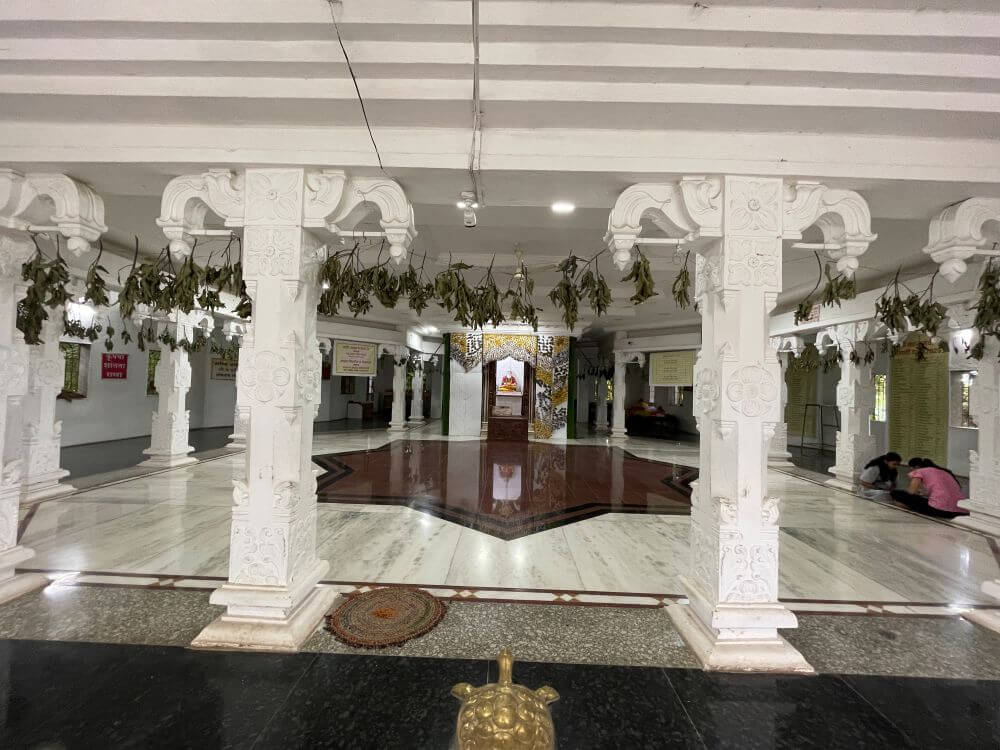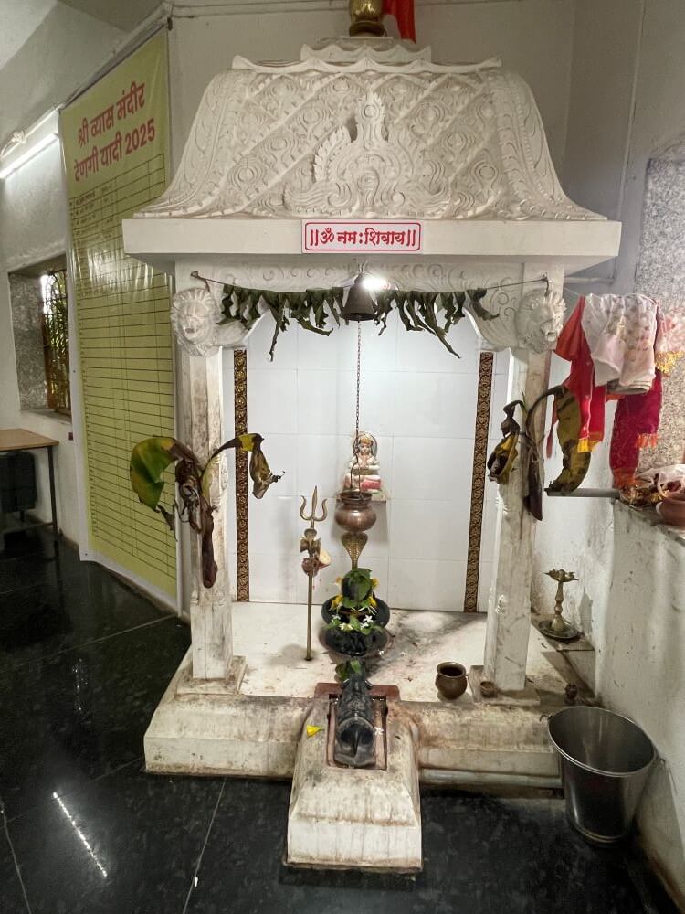 येथून काही पायऱ्या चढून मंदिराच्या निसर्गरम्य प्रांगणात प्रवेश होतो. प्रांगणात उंच अधिष्ठानावर व्यासांचे मंदिर स्थित आहे. १६ पायऱ्या चढून या मंदिराच्या मुखमंडपात प्रवेश होतो. येथे डावीकडे देवळीत हनुमानाचे, तर उजवीकडे शंकराचे स्थान आहे. मध्यभागी मोठे पितळी कूर्मशिल्प आहे. त्या शेजारी एका चौथऱ्यावर दंडगोलाकार पाषाण आहे. यास इच्छापूर्तीचा गोटा असे म्हणतात. भाविकांची अशी श्रद्धा आहे की हा गोटा चार बोटांनी उचलून ठेवताना जर फिरला तर त्या व्यक्तीची इच्छा पूर्ण होते. मंदिराचा सभामंडप प्रशस्त आहे. सभामंडपात कोरीव नक्षीकाम केलेले १८ पांढरेशुभ्र स्तंभ आहेत. हे स्तंभ अठरा पुराणांचे प्रतिक मानले जातात. सभामंडपात दोन संगमरवरी देवळ्या आहेत. त्यातील एका देवळीत उजव्या सोंडेचा रिद्धी गणेश, तर दुसऱ्या देवळीत डाव्या सोंडेचा सिद्धी गणेश विराजमान आहे. गर्भगृहात एका शुभ्र चौथऱ्यावर महर्षी व्यासांची संगमरवरी मूर्ती विराजमान आहे. सुखासनात बसलेल्या महर्षि व्यास ऋषिंच्या हातात महाभारत ग्रंथ आहे. गर्भगृहावर उंच व वैशिष्ट्यपूर्ण शिखर आहे.