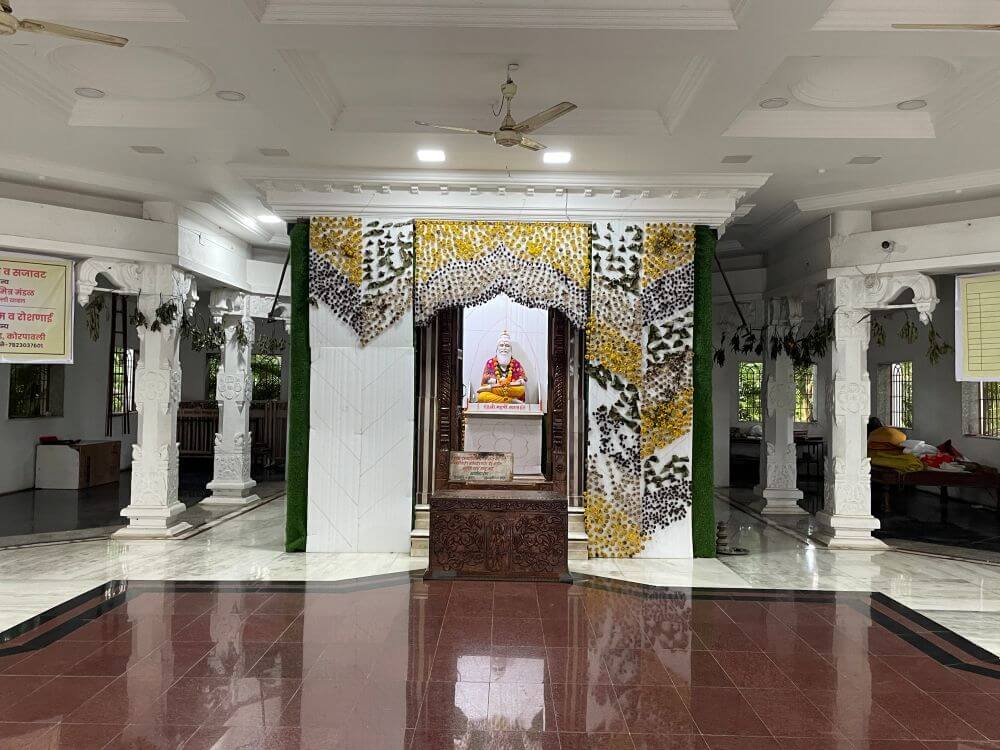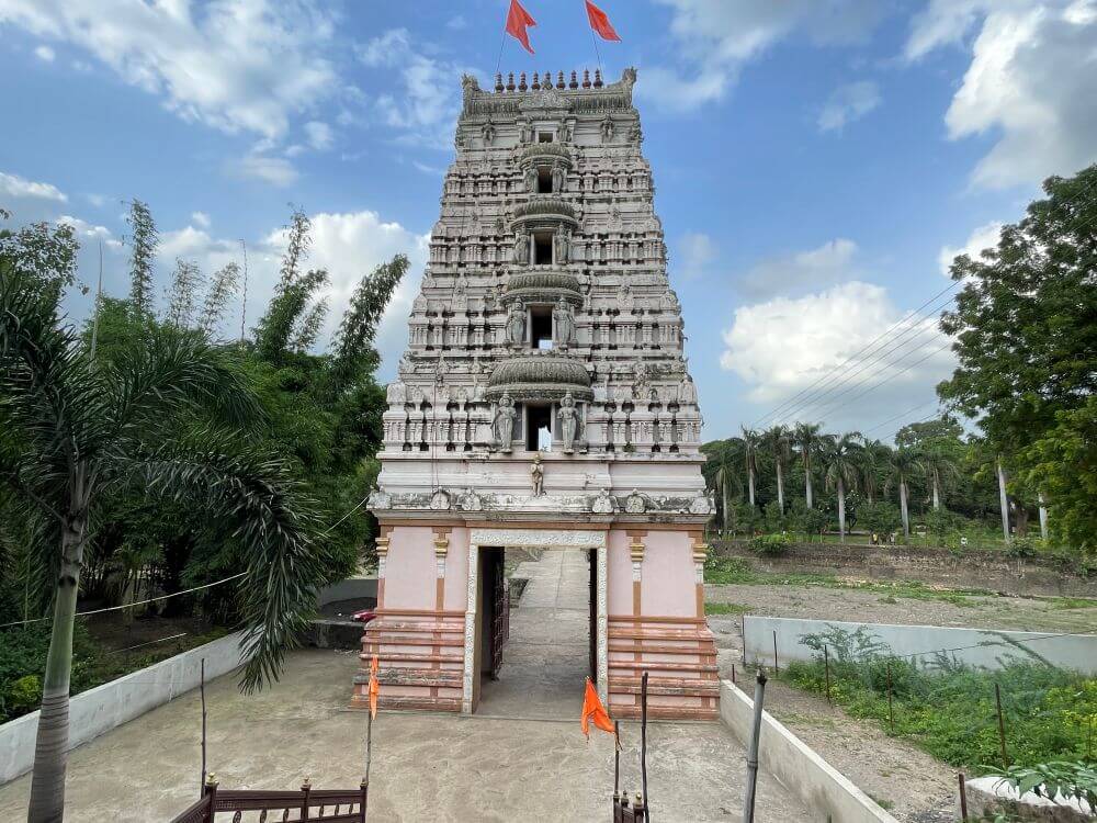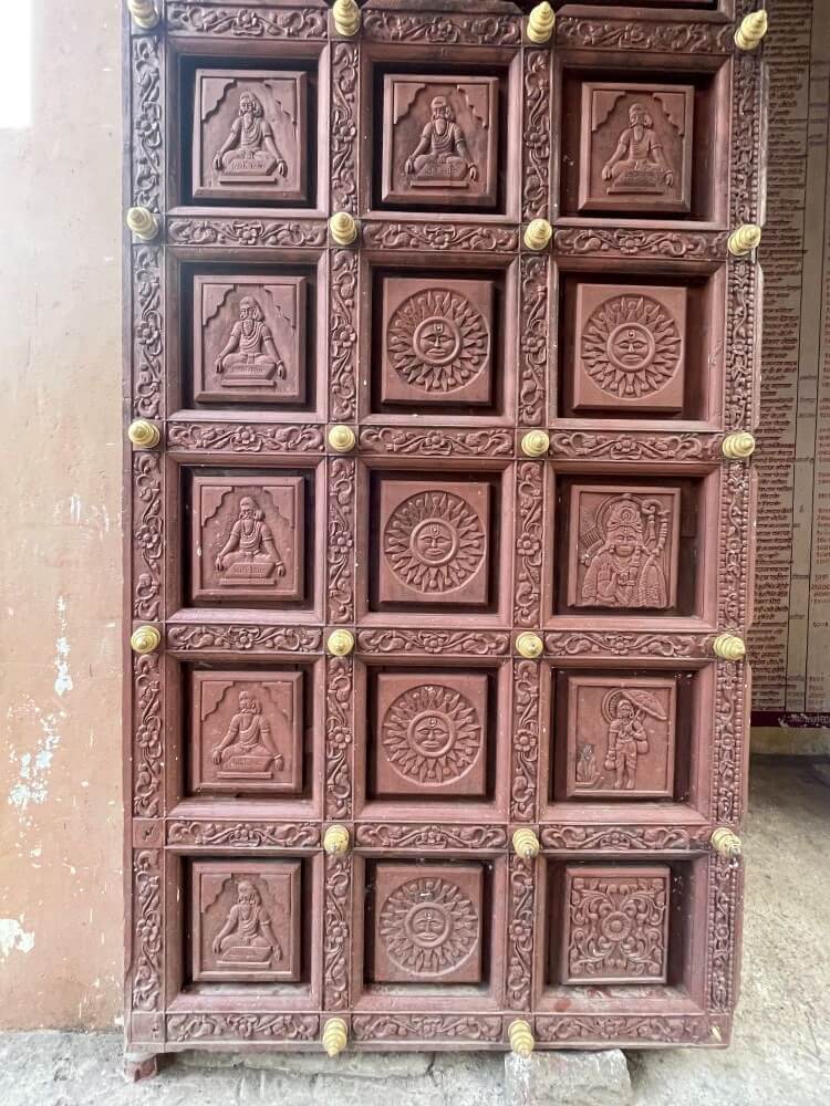 भागात मंदिर नामफलकाच्या वर लक्ष्मी, गणपती आणि सरस्वतीच्या मूर्ती आहेत. गोपुराच्या पाच स्तरीय शिखरावर विविध शिल्पे आणि कोरीव नक्षीकाम केलेले आहे. महाद्वाराच्या भव्य लाकडी दरवाजांवर महर्षी व्यास, श्रीराम, सूर्यनारायण यांच्या प्रतिमा कोरलेल्या आहेत.