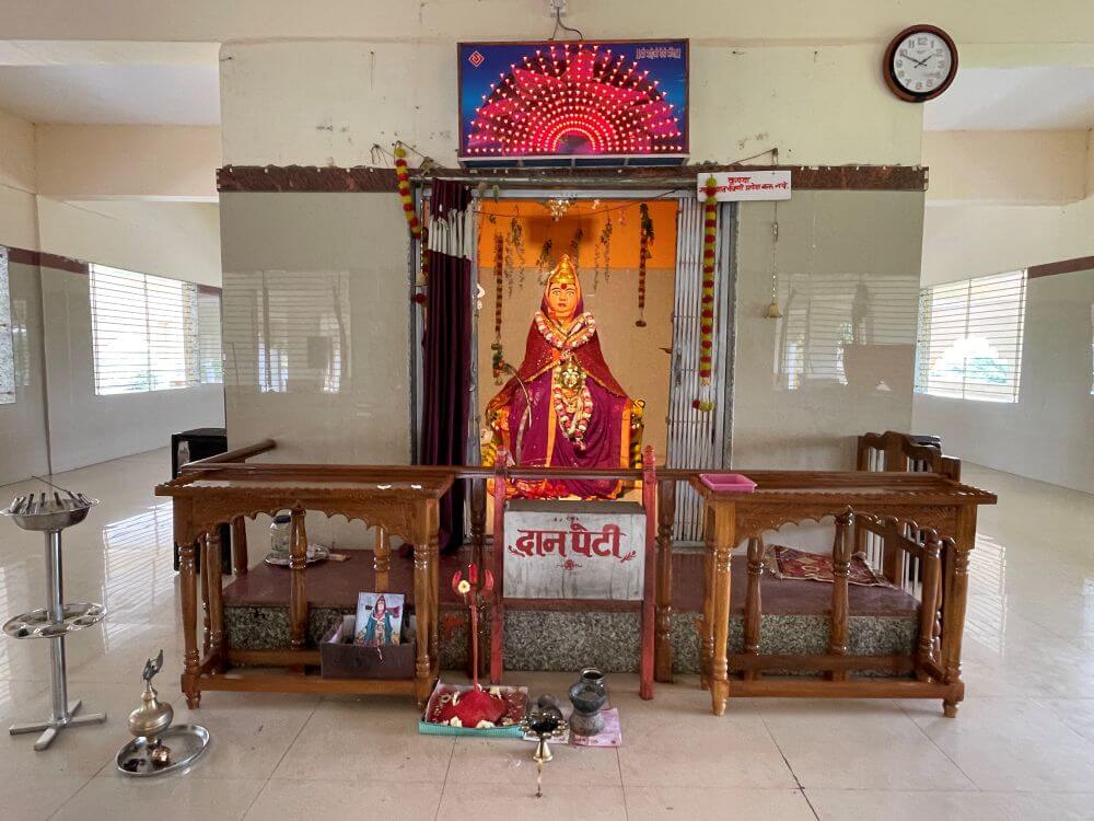 येथील अंतराळ व गर्भगृह हे सभामंडपापेक्षा उंचावर आहेत. अकरा पायऱ्या चढून अंतराळात प्रवेश होतो. अंतराळाच्या प्रवेशद्वाराजवळ आतील बाजूला कासवशिल्प आहे. त्यापुढे असलेल्या गर्भगृहात माहिजी देवी व तिची बहिण यांच्या मूर्ती आहेत. माहिजी देवीची मूर्ती काहीशी उग्र आहे. केस मोकळे, नाकात नथ, कपाळावर कुंकू, गळ्यात दागिने असे या मूर्तीचे स्वरूप आहे. त्या मूर्तीच्या खालच्या बाजूला एक सोनेरी मुखवटा परिधान केलेली दुसरी मूर्ती आहे. तिच्या ही नाकात नथ, गळ्यात दागदागिने व कपाळावर कुंकू आहे. या गर्भगृहाभोवती प्रदक्षिणा मार्ग आहे. या प्रदक्षिणा मार्गावरून गिरणा नदीचे दर्शन होते. मंदिराच्या गर्भगृहावर सुमारे ३० फूट उंचीचे शिखर व त्यावर कळस आहे.