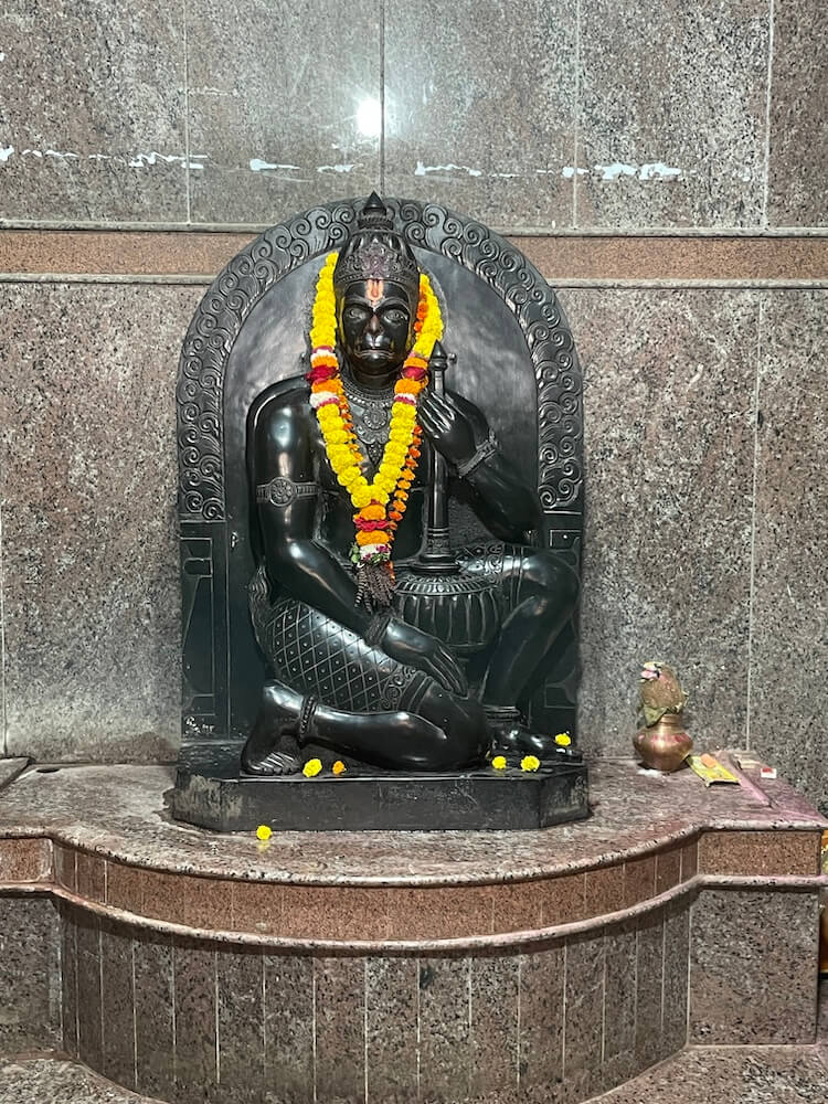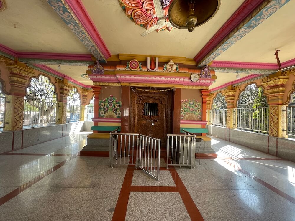 तोरणाच्या वर शंख व चक्र नक्षी तसेच दाक्षिणात्य शैलीतील शुभचिन्हे आहेत. प्रवेशद्वाराच्या नक्षीदार झडपांवर मयूर तोरण आणि पानाफुलांची नक्षी दिसते. प्रशस्त गर्भगृहात मागील भिंतीलगत असलेल्या वज्रपीठावर मकरध्वज देवाची काळ्या पाषाणातील प्राचीन कोरीव द्विभुज मूर्ती विराजमान आहे. मकरध्वज एका गुडघ्यावर वीर मुद्रेत बसलेला आहे आणि त्याच्या हातात गदा आहे. मूर्तीला लंगोट नेसवलेला आहे. त्याचप्रमाणे त्याच्या पायात तोडे, हातात कडे, दंडास बाजूबंद, गळ्यात विविध प्रकारचे हार, कानात कुंडले व डोक्यावर मुकुट आहे. मूर्तीच्या मागे पाठशिळेवर संयुक्त नक्षी कोरलेली आहे. गर्भगृहाच्या बाह्य बाजूने प्रदक्षिणा मार्ग आहे. मंदिराच्या छतावर चोहोबाजूंनी सुरक्षा कठडा आहे आणि या कठड्यात देवकोष्ठके आहेत. देवकोष्ठकांत विविध देवतांच्या मूर्ती आहेत. गर्भगृहाच्या छतावर द्रविडी शैलीतील पाच थरांचे चौकोनी शिखर आहे आणि या शिखराच्या प्रत्येक थरात ‘कुट’ व ‘शाल’ रचना आहेत. शिखराच्या सर्व थरात चारही बाजूंना असलेल्या देवकोष्ठाकांत विविध देवतांच्या मूर्ती आहेत. शिखराच्या शीर्षभागी चारही बाजूंना उपशिखरे आहेत आणि मध्यभागी स्तुपिका व त्यावर कळस आहे. या मंदिराच्या शेजारी प्रांगणात मणकावती देवीचे प्राचीन मंदिरही आहे.