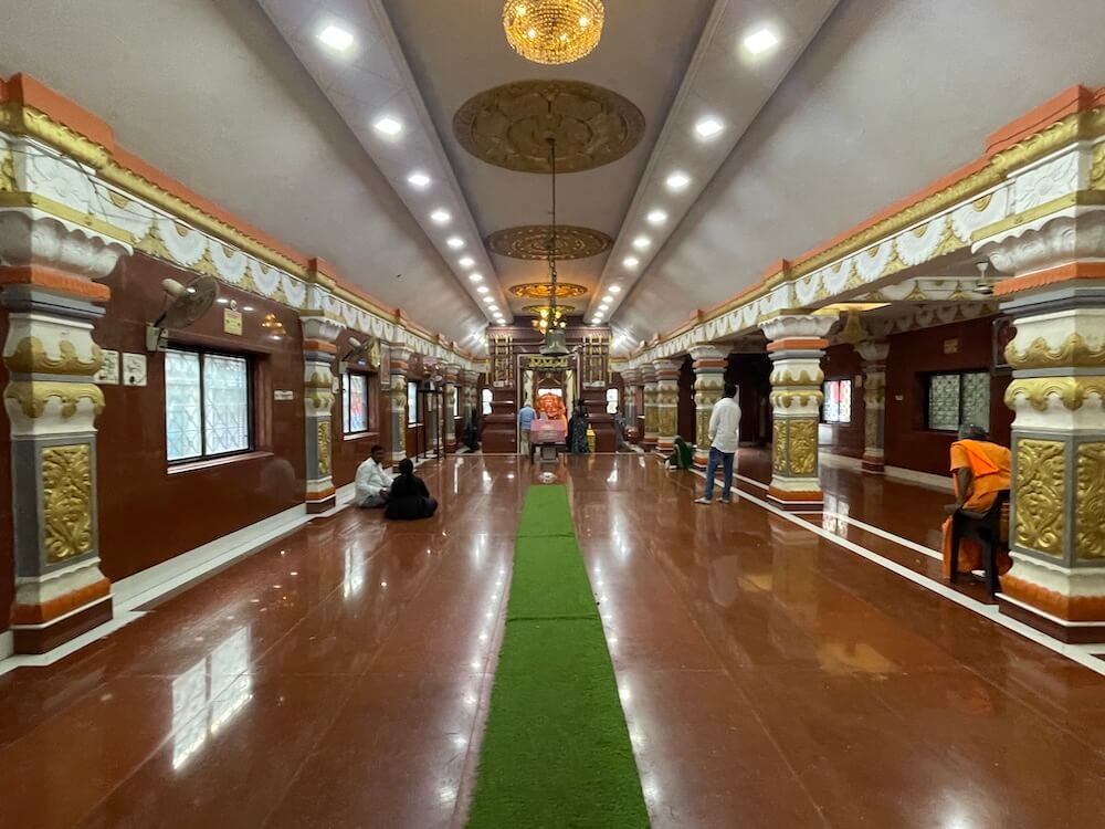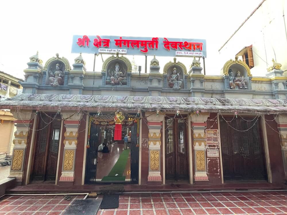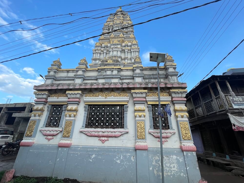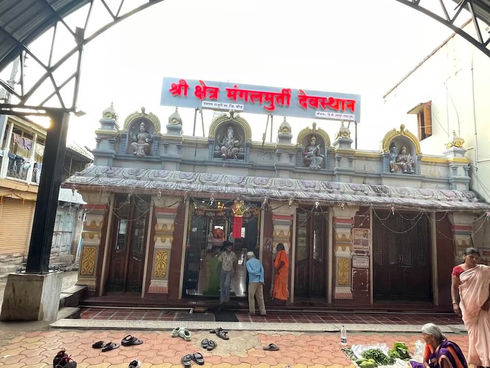 हे मंदिर गावातील वर्दळीच्या रस्त्याला लागून आहे. मंदिराभोवती रस्त्यापेक्षा काही इंच उंच चौथरा आहे. त्यावर सभामंडप व गर्भगृह अशी मंदिराची रचना आहे. सभामंडपास समोरील बाजूने चार प्रवेशद्वारे आहेत. प्रत्येक प्रवेशद्वाराच्या दोन्ही बाजूला नक्षीदार स्तंभ आहेत. सभामंडपात प्रत्येकी आठ नक्षीदार चौकोनी स्तंभांच्या तीन रांगा आहेत. हा सभामंडप बंदिस्त स्वरूपाचा आहे. येथील डाव्या व उजव्या बाजूच्या रांगांतील स्तंभ भिंतीत आहेत. सर्व स्तंभ चौकोनी स्तंभपादावर उभे आहेत आणि त्यांच्या दंडावर पानाफुलांच्या नक्षी कोरलेल्या आहेत. सभामंडपात जमिनीवर काचबंद पेटीत चांदीचे कासवशिल्प आहे, तर वज्रपीठावर गणपतीचे वाहन असलेल्या मूषकाचे पितळी शिल्प आहे. मूषक शिल्पापुढे चांदीच्या पादुका आहेत. पुढे चारही बाजूंनी दरवाजे असलेले गर्भगृह आहे.