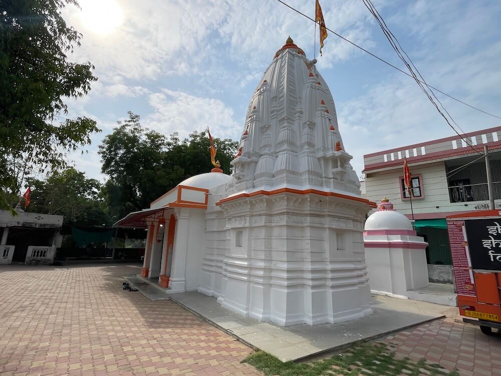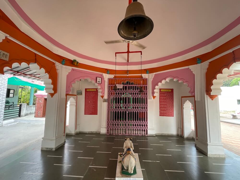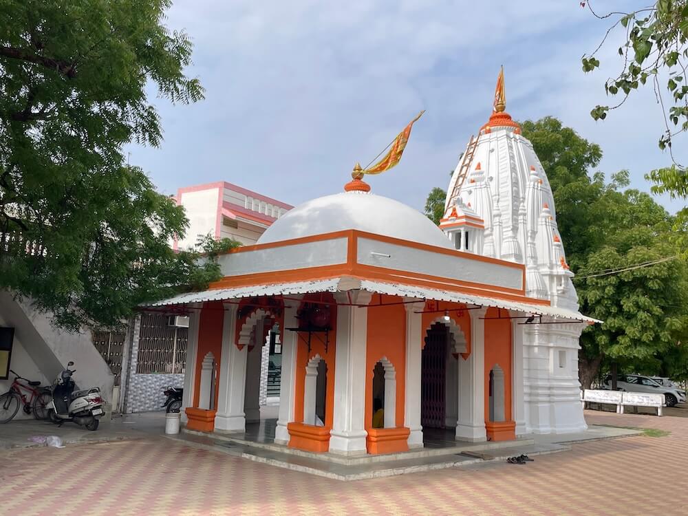 The temple complex is paved with interlocking paver blocks and houses a serene courtyard with a sacred peepal tree that is over 200 years old. Stone benches have been installed around the premises for devotees to sit and meditate. Architecturally, the temple is built in the traditional Nagar style, with a semi-open assembly hall (sabhamandap), an antechamber (antaral) and a sanctum (garbhagriha). The dome atop the sabhamandap is surmounted by a small amalaka and finial (kalasha), while the sanctum has a towering urushringa-style spire. The sabhamandap features wide rectangular pillars supporting arches (mahirpi kaman). A small pedestal in the hall holds a stone statue of Nandi, Shiva’s loyal bull, with a carved tortoise platform in front. The antechamber, lined with marble tiles, houses a stone idol of Hanuman in the right shrine and a white marble idol of Ganesha in the left.