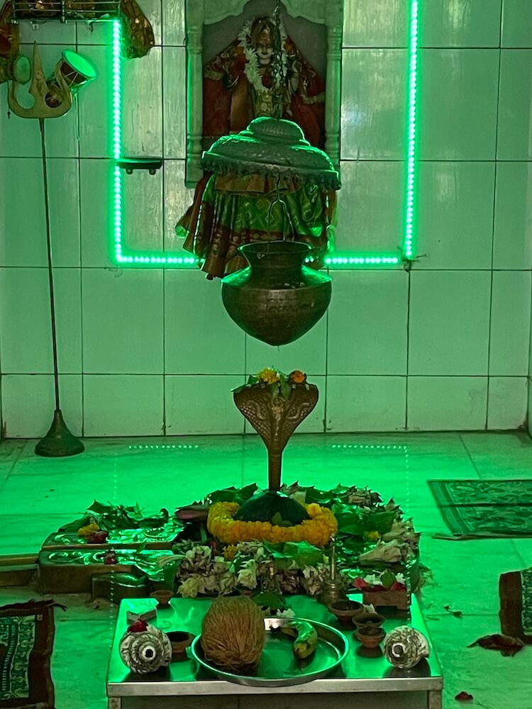 Above the sanctum’s entrance is a sculptural panel depicting Shiva, Parvati and Ganesha. Inside the sanctum, the Shivalinga rests within a large shalunka (base), shaded by a brass serpent hood and topped with a silver parasol. Behind the linga is a niche dedicated to Goddess Parvati.