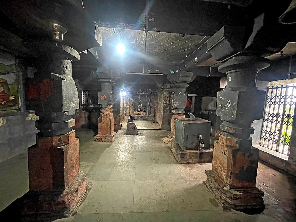 पुढे सभामंडपाचे प्रवेशद्वार आहे. या प्रवेशद्वारास लोखंडी जाळीदार सरकत्या झडपा आहेत. या बंदिस्त स्वरूपाच्या सभामंडपात प्रत्येकी चार नक्षीदार स्तंभांच्या चार रांगा आहेत. बाह्य बाजूचे स्तंभ भिंतीत आहेत. स्तंभांचा तळाकडील सुमारे तीन फूट भाग चौकोनी व त्यावरील भाग चौकोन, षट्कोन, अष्टकोन, वर्तुळ अशा विविध भौमितिक आकारांत आहे. शीर्षभागी वर्तुळाकार कणी व त्यावर हस्त आहेत. सभामंडपात मध्यभागी वज्रपीठावर काळ्या पाषाणातील नंदीची मूर्ती आहे. उजव्या बाजूला चौथऱ्यावर लोखंडी हुंडी आहे.