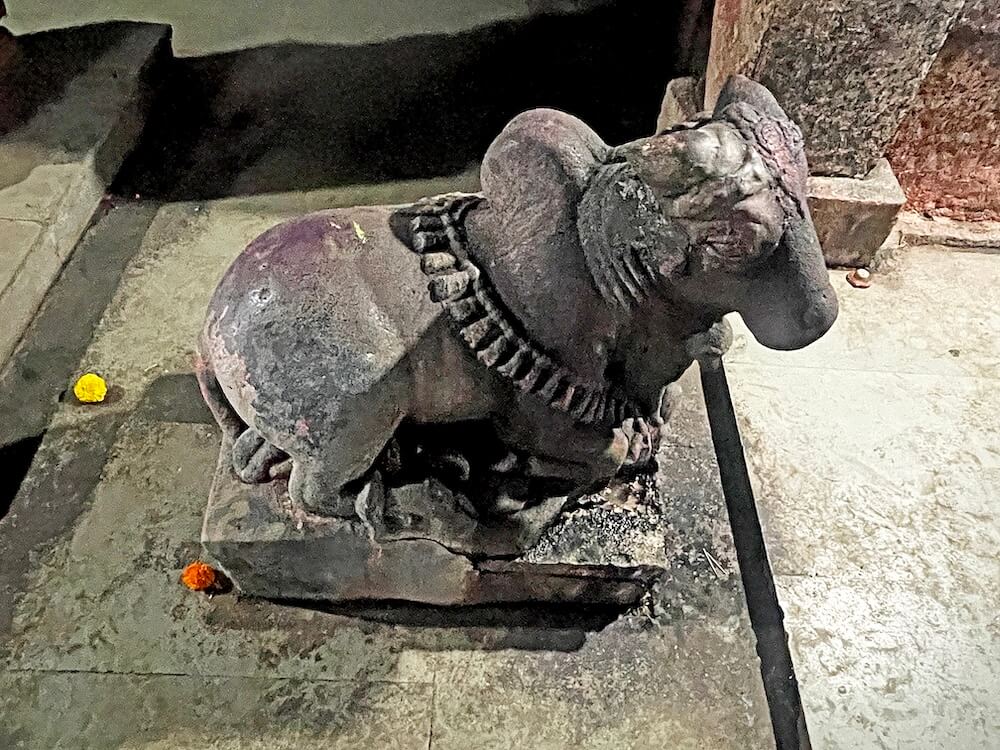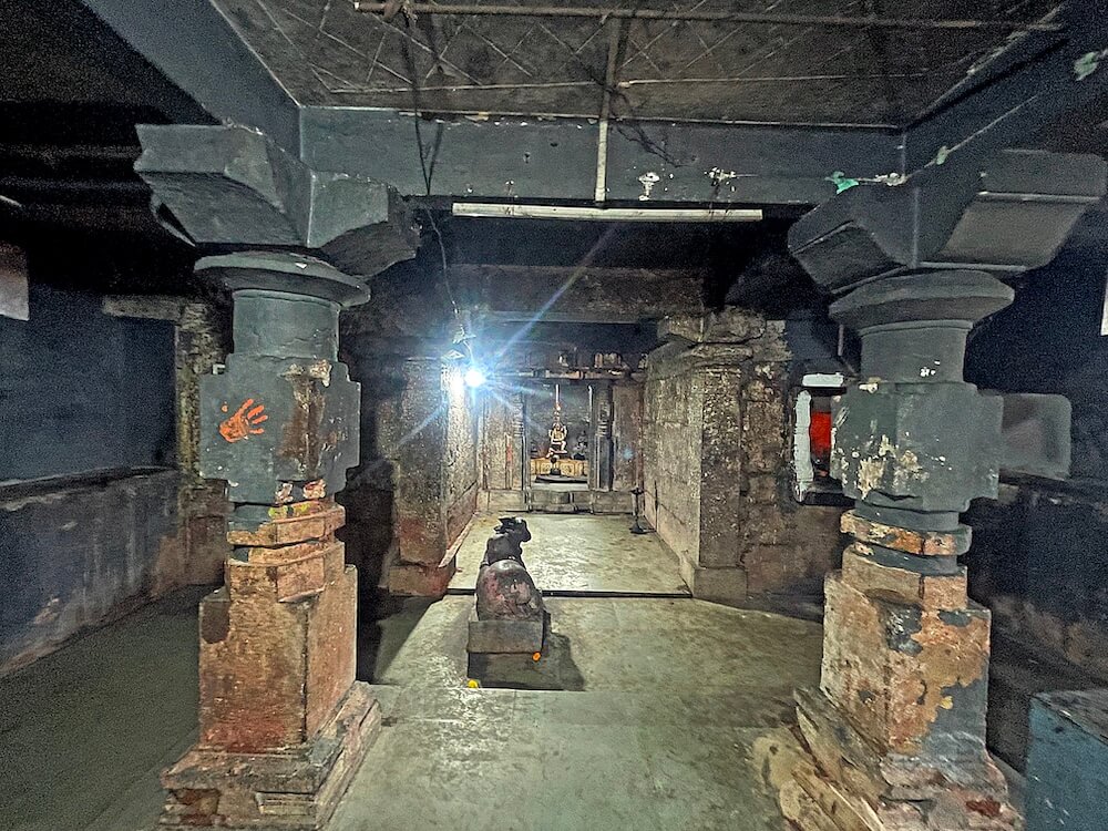 पुढे सभामंडपाचे प्रवेशद्वार आहे. या प्रवेशद्वारास लोखंडी जाळीदार सरकत्या झडपा आहेत. या बंदिस्त स्वरूपाच्या सभामंडपात प्रत्येकी चार नक्षीदार स्तंभांच्या चार रांगा आहेत. बाह्य बाजूचे स्तंभ भिंतीत आहेत. स्तंभांचा तळाकडील सुमारे तीन फूट भाग चौकोनी व त्यावरील भाग चौकोन, षट्कोन, अष्टकोन, वर्तुळ अशा विविध भौमितिक आकारांत आहे. शीर्षभागी वर्तुळाकार कणी व त्यावर हस्त आहेत. सभामंडपात मध्यभागी वज्रपीठावर काळ्या पाषाणातील नंदीची मूर्ती आहे. उजव्या बाजूला चौथऱ्यावर लोखंडी हुंडी आहे.