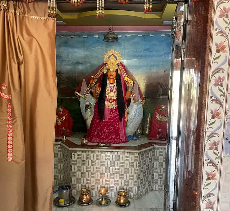 According to the local tale, that very night the trident drifted to the hither bank. The priests subsequently performed the consecration rites and placed it beside the idol of the Goddess.