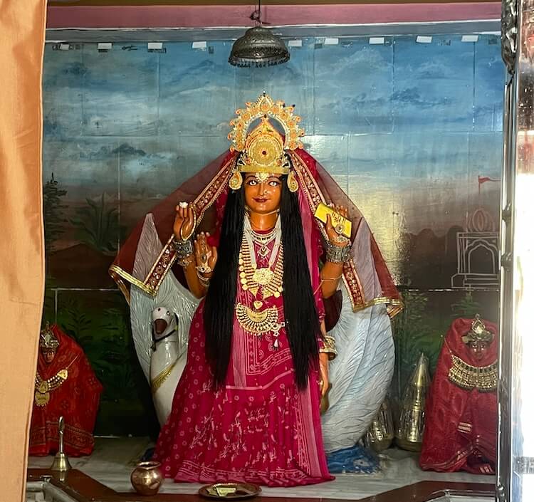 Beyond the stainless-steel railings of the vestibule lies the first sanctum, enshrining a four-armed idol of the Goddess seated upon a goat. Draped in fine clothes and ornaments, she wears a silver crown and holds the miraculous trident. She is flanked by two ancient idols, said to represent her auxiliary powers. To the left sits the second sanctum,