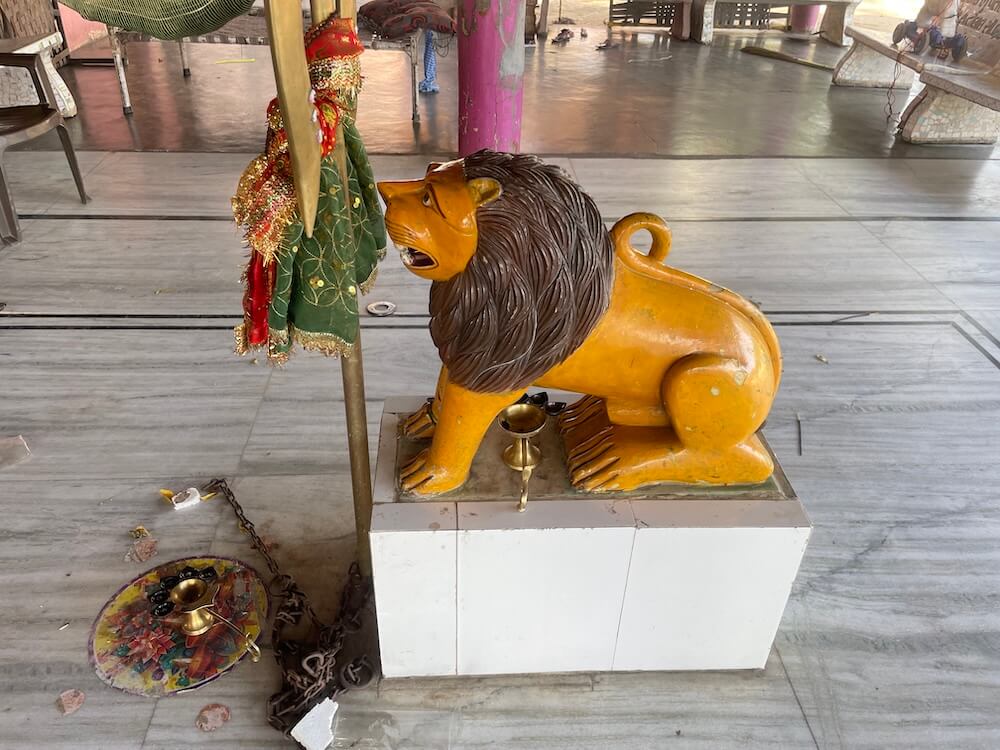 The ceiling of the hall is festooned with hundreds of ‘Chunris’ (sacred scarves) offered in fulfilment of vows. Within the hall, a ‘Yagnakunda’ (sacrificial fire pit) and seating for pilgrims are provided. Facing the sanctum entrance is a large sculpture of a lion, the Goddess’s ‘Vahana’ (mount), resting upon a ‘Vajrapitha’ (stone pedestal), fronted by a grand ‘Trishul’. Devotees believe that circumambulating this trident alleviates physical ailments and menstrual distress.
