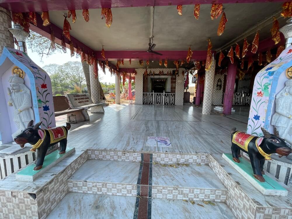 A well-paved road leads to the temple, which sits somewhat secluded from the village and is fronted by a spacious parking area. The architectural layout consists of a common ‘Sabhamandap’ (assembly hall) leading to two distinct ‘Garbhagrihas’ (sanctum sanctorums), each preceded by an ‘Antaral’ (vestibule). The hall is slightly elevated above the courtyard and features two entrances guarded by ‘Dwarpala’ (gatekeeper) sculptures. The first entrance is flanked by stone lions, while the steps on the left are guarded by ‘Aja’ (goat) sculptures.