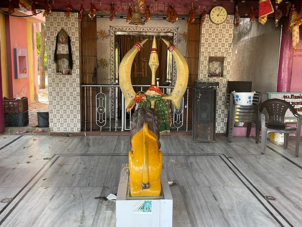 The temple boasts an antiquity of approximately four to five hundred years, though it has undergone extensive restoration in recent times. Situated on the riverbank, the village cremation ground lies but a short distance away. A captivating legend surrounds the ‘Trishul’ housed within the sanctum. It is said that in the year 2014, this metallic trident came floating down the Vatrak. For several days, it remained suspended upon the water near the opposite bank. Perceiving this as a divine portent, the villagers implored the temple priest to enshrine it. Before the gathered community, the priest made a solemn petition to the Goddess that if the trident were to float across to their side of the river, it would be established within her temple.