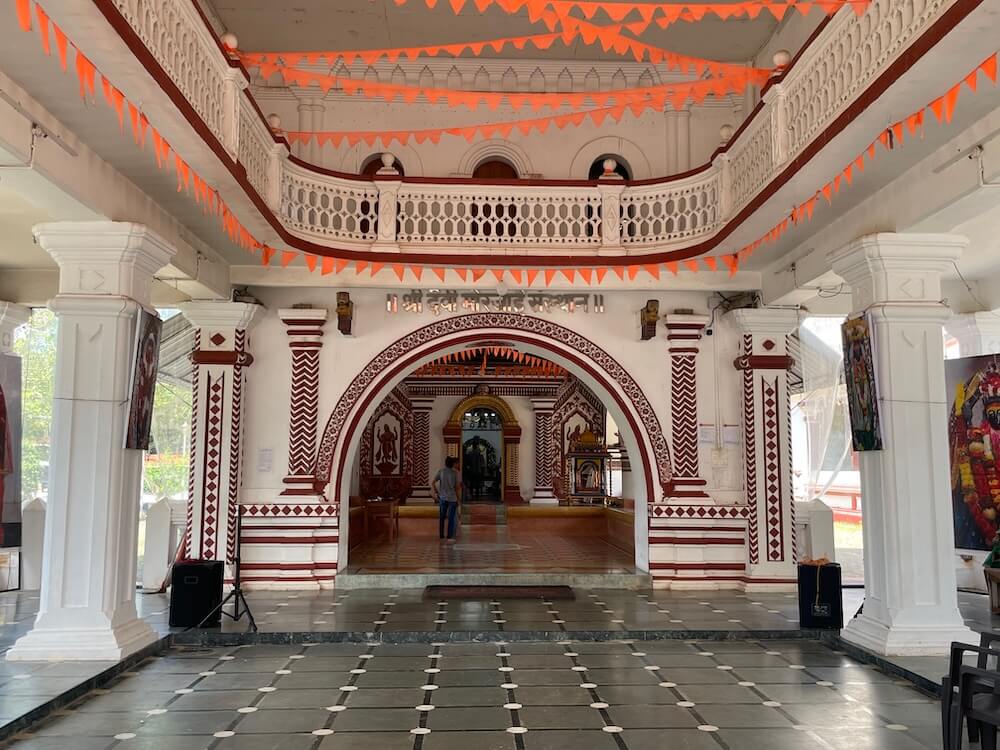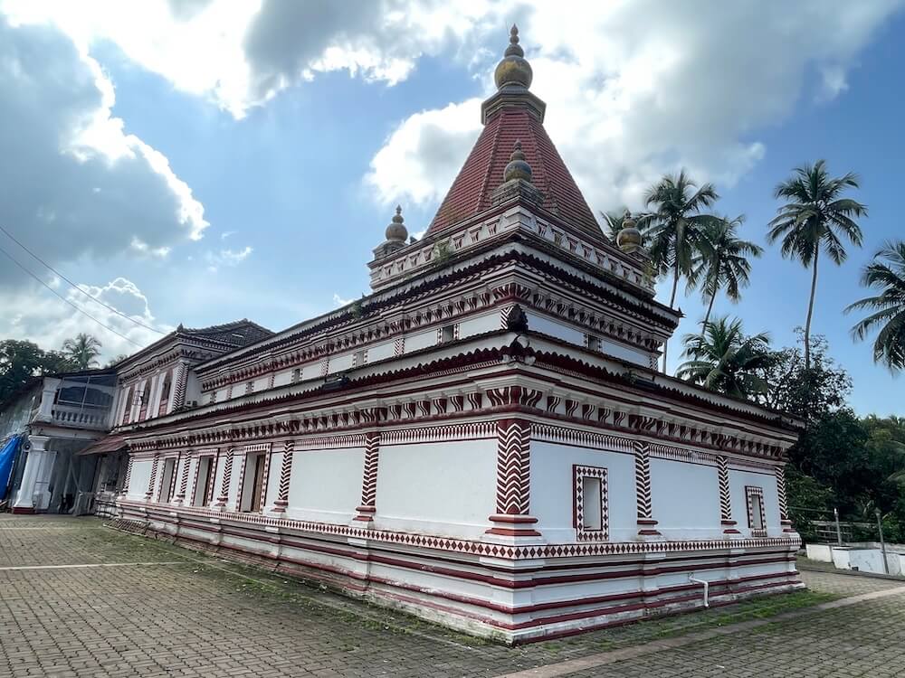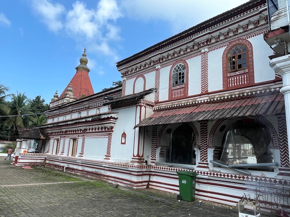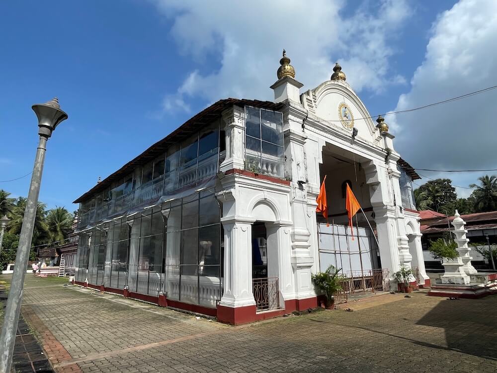 सध्या या महाद्वाराच्या पुढे मोठा रंगमंच बांधण्यात आलेला आहे. मंदिरासमोर एका चौथऱ्यावर तुळशी वृंदावन आणि पाच स्तरीय दीपस्तंभ आहे. हे मंदिर गोव्यातील अन्य काही मंदिरांप्रमाणेच भव्य आणि गोमंतकीय स्थापत्यशैलीतील आहे. या मंदिराचे सर्वांत लक्षणीय वैशिष्ट्य म्हणजे त्यावरील कावी कलेतील (स्ग्रॅफिटो) नक्षीकाम. खासकरून कोकण आणि गोवा प्रांतात आढळणारी ही वैशिष्ट्यपूर्ण कला आहे. यात प्रथम भिंतीवर लाल मातीचा गिलावा केला जातो. त्यावर चुन्याचा गिलावा दिला जातो. हा चुन्याचा गिलावा ओला असतानाच, त्यात अशा प्रकारे कोरीव नक्षीकाम केले जाते की आतील लाल रंग उठून दिसावा. मोरजाई मातेच्या प्राचीन मंदिराच्या बाह्यभिंतींवर, गवाक्षांच्या कमानींवर, आतील स्तंभांवर, तसेच वितानावरही अशा प्रकारे कावी काम केलेले होते. जीर्णोद्धारातही ते नक्षीकाम कायम ठेवलेले आहे.