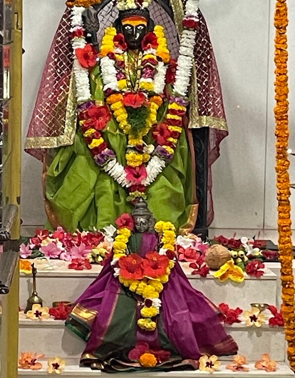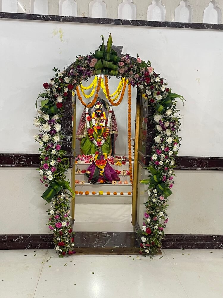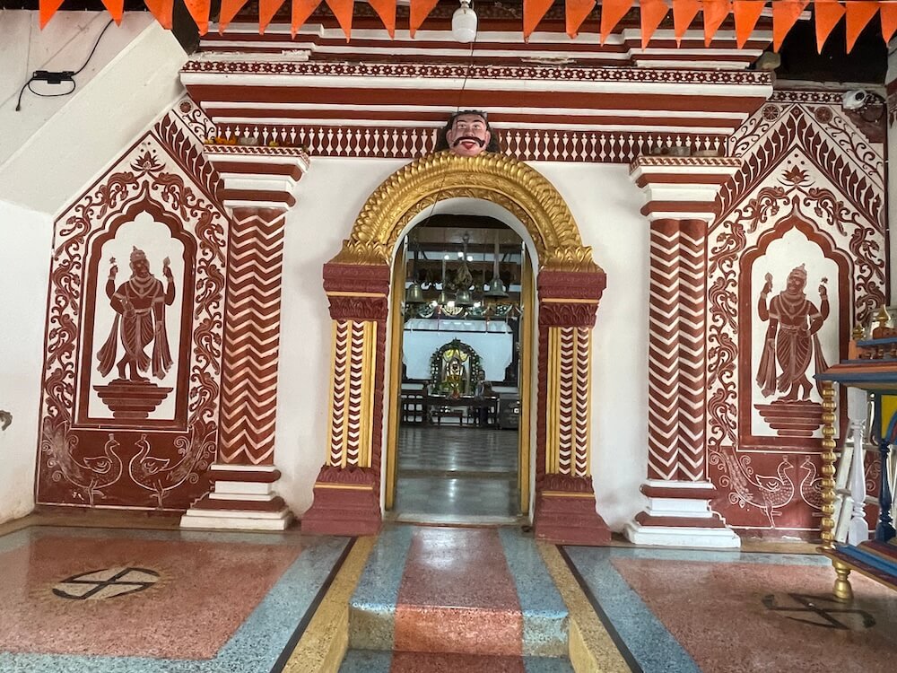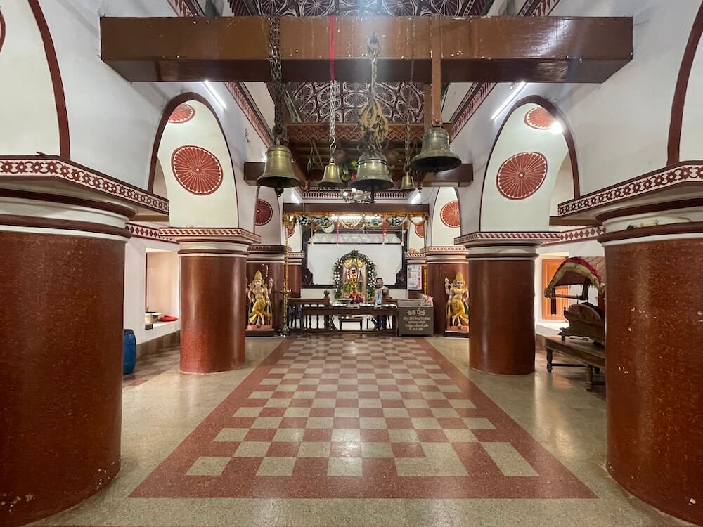 अर्धखुल्या प्रकारच्या या सभामंडपाच्या बाह्य बाजूस कमी उंचीचे कठडे लावलेले आहेत. येथून डावीकडून आणि उजवीकडून काही फूट अंतर सोडून चौकोनाकार स्तंभ उभारलेले आहेत. त्यावर सज्जा बांधलेला आहे. सभामंडपातील स्तंभांवर देवीच्या विविध रुपांतील प्रतिमा लावलेल्या आहेत. या सभामंडपातून मंदिराच्या अर्धमंडपात प्रवेश होतो. अर्धमंडपात प्रवेशासाठी मोठी अर्धगोलाकार कमान बांधलेली आहे. या कमानीवर, तसेच तिच्या बाजूस असलेल्या स्तंभांवर कावी कलेतील नक्षीकाम केलेले आहे. अर्धमंडपात बाजूने सोप्यासारखी रचना केलेली आहे. येथे एका बाजूस देवीचा मखर ठेवलेला आहे. या अर्धमंडपाच्या आतील स्तंभांवर, भिंतींवर व छतावरही कावी कलेतील नक्षी कोरलेली आहे. यातही मंदिराच्या गर्भगृहाच्या दर्शनीभिंतीवर प्रवेशद्वाराच्या दोन्ही बाजूंस कावी कला प्रकारात रंगवलेल्या दोन द्वारपालांच्या तसेच मयूरांच्या प्रतिमा लक्षणीय आहेत. गर्भगृहाच्या कमानदार प्रवेशद्वारास दोन्ही बाजूंनी दगडी स्तंभ आहेत. कमानीच्या मध्यभागी, ललाटबिंबस्थानी कीर्तिमुख आहे.