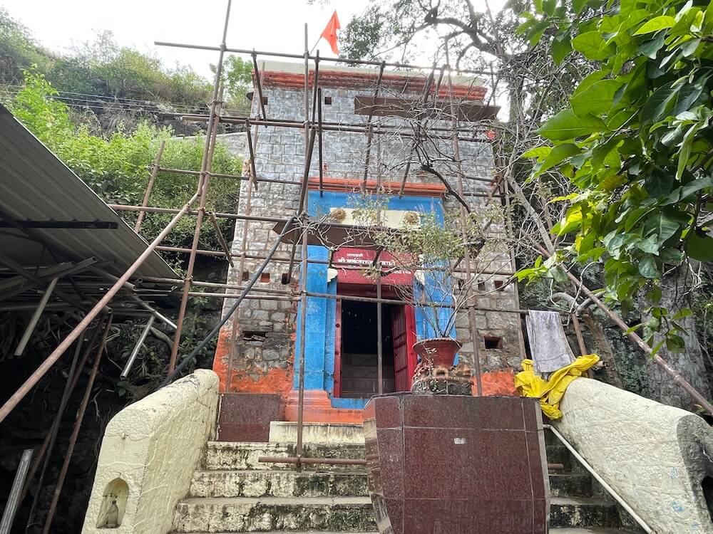 समाधी मंदिराच्या समोर एका बाजूला खोल दरी व दुसऱ्या बाजूला उंच डोंगरकडा आहे. या ठिकाणी लोखंडी स्तंभांवर पत्र्याचे छत असा अर्धखुल्या स्वरूपाचा सभामंडप आहे. सभामंडपात दरीच्या बाजूने पाषाण बांधणीचा कठडा आहे. पुढे तुळशी वृंदावन व त्यापुढे गर्भगृह आहे. गर्भगृह सभामंडपापेक्षा उंचावर असल्यामुळे सुमारे दहा पायऱ्या चढून वर जावे लागते. पायऱ्यांच्या दोन्ही बाजूला सुरक्षा कठडे आहेत. यामध्ये दीपकोष्ठके आहेत.
