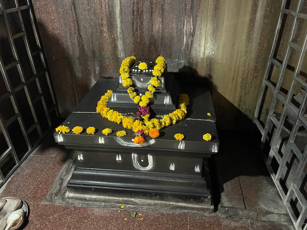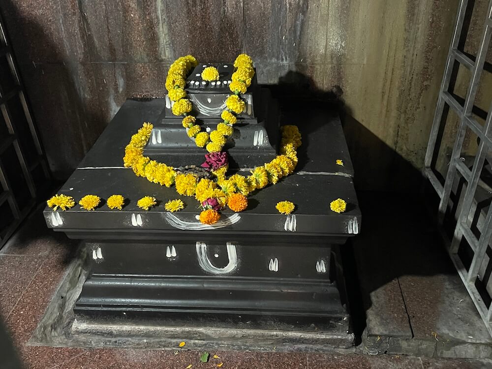 शिवपाषाण वस्त्रे व अलंकारांनी सुशोभित आहे. गर्भगृहात छताला पितळी घंटा टांगलेल्या आहेत.