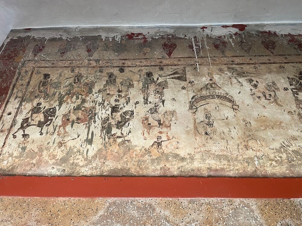 गर्भगृहाच्या बाह्य बाजूने अर्धप्रदक्षिणा मार्ग आहे. गर्भगृहाच्या बाह्य भिंतींवर प्राचीन चित्रे रंगवलेली आहेत. नैसर्गिक रंगात चितारलेली ही चित्रे ऐतिहासिक दृष्ट्या महत्त्वाची समजली जातात. यापैकी काही उठाव शैलीतील चित्रे माती व चिखलाचा वापर करून साकारली गेली आहेत. यातील अनेक चित्रे कालौघात नाहीशी झाली असून काही अस्पष्ट झाली आहेत. हल्ली पाहता येण्याजोग्या चित्रांमध्ये श्रीकृष्ण लीला, पौराणिक प्रसंग व इतर काही चित्रांचा समावेश होतो. यातील एका चित्रात देव आणि दानवांनी मिळून केलेले ‘समुद्र मंथन’ व त्यातून बाहेर पडलेली चौदा रत्ने अगदी विस्ताराने चितारली आहेत. दुसऱ्या चित्रात गोवर्धन पर्वत उचललेला श्रीकृष्ण व इतर गोपाल चितारले आहेत. इतर चित्रांमध्ये महिषासुरमर्दिनी, वेणुगोपाल, महाभारताचे महायुद्ध, राजदरबार, दशावतार इत्यादी चित्रे विशेष उल्लेखनीय आहेत. या मंदिराच्या सभामंडप व गर्भगृहावर कौलारू छत आहे.
