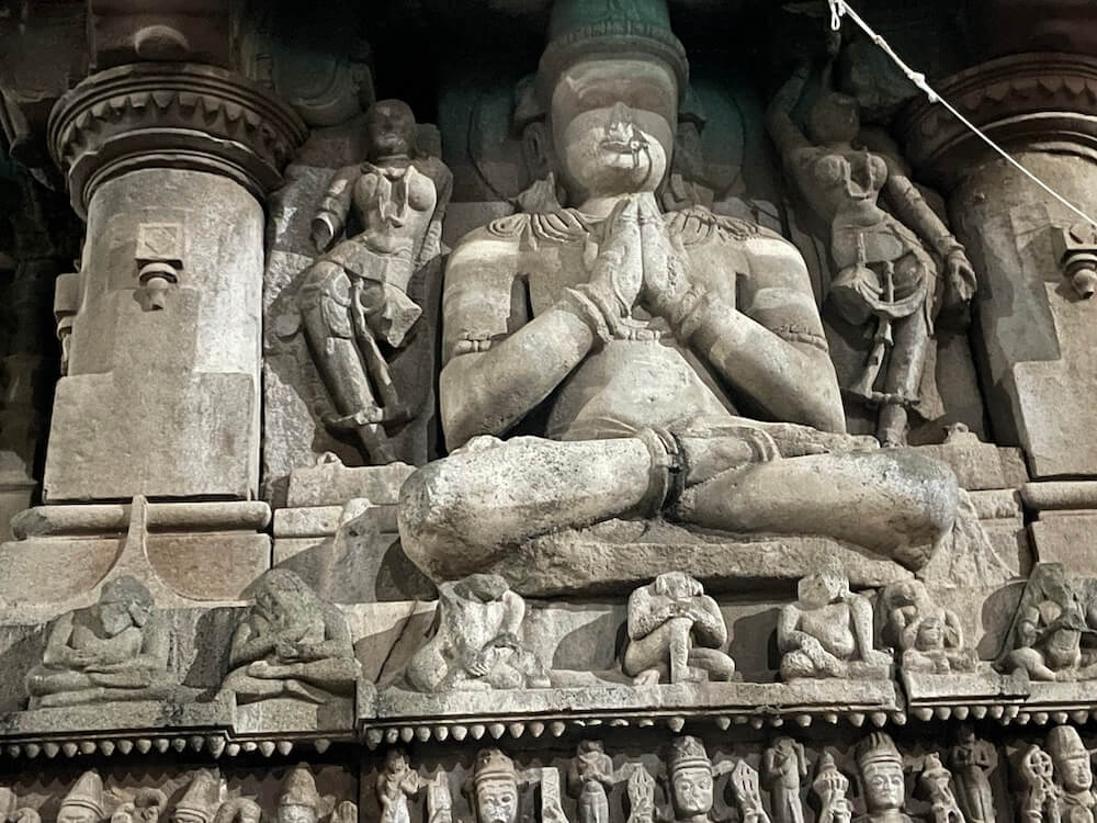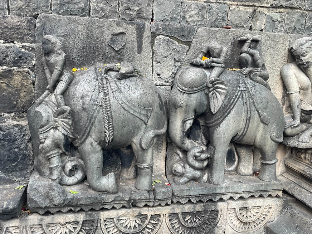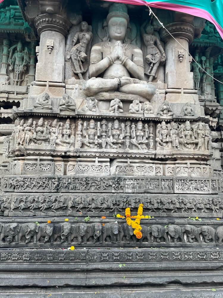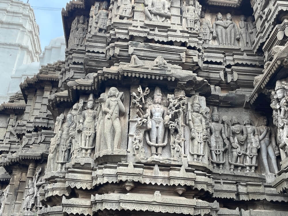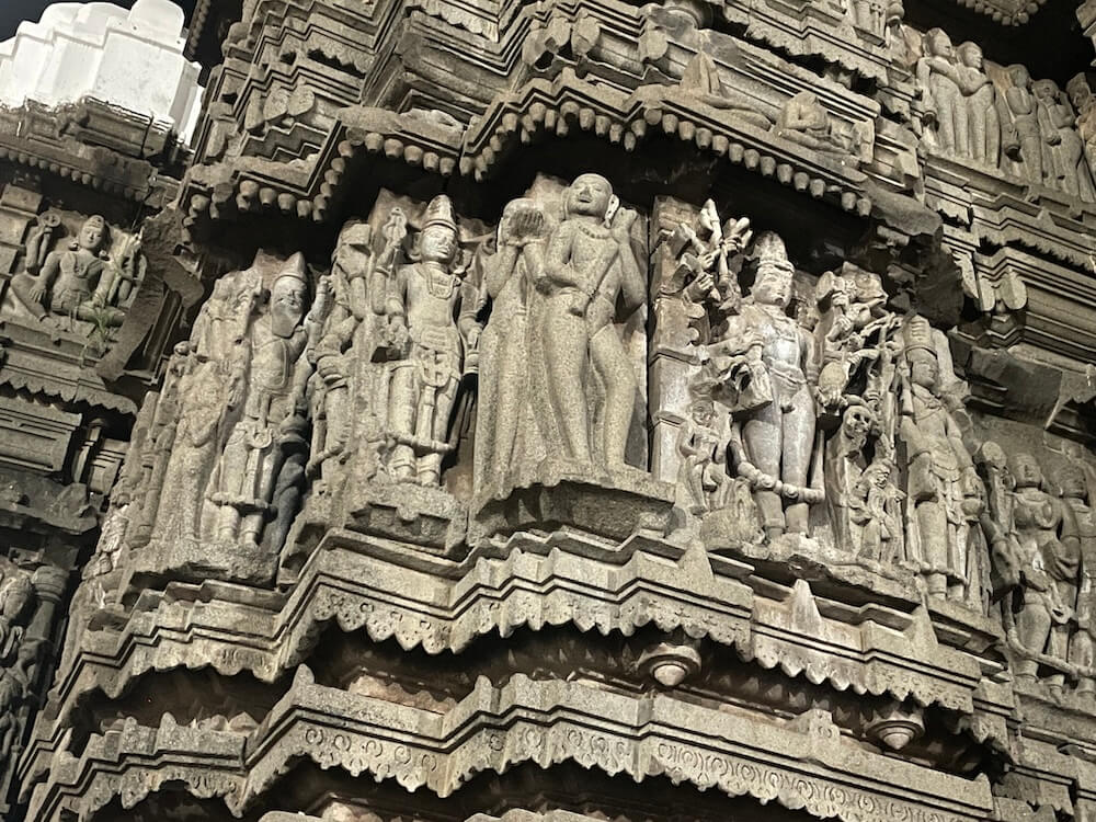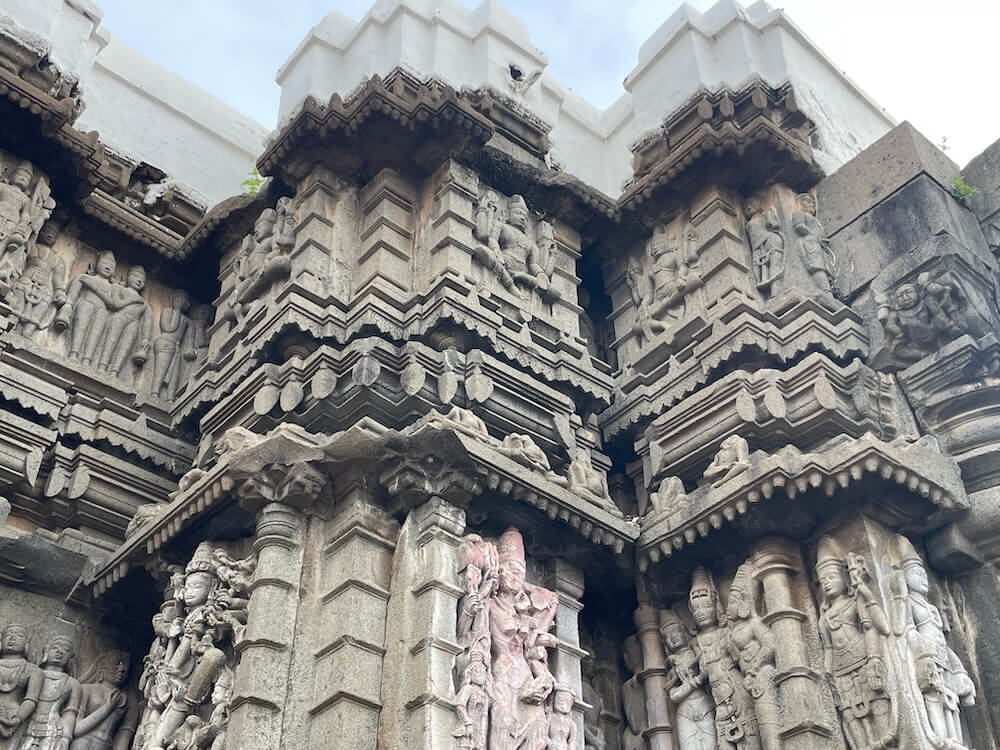 यक्ष-यक्षिणी, अप्सरा आणि विविध भौमितिक नक्षीकाम आहे. शिव-पार्वती कैलास पर्वतावर बसले आहेत आणि रावण कैलास पर्वत हलवण्याचा प्रयत्न करत आहे (रावणानुग्रह मूर्ती) अशा प्रकारची पौराणिक कथा सांगणारी अनेक शिल्पे कोरलेली आहेत. या मंदिराची शिखरापर्यंतची उंची ६० फूट आहे. चुन्यामध्ये बांधलेले त्यावरील पांढरे शुभ्र शिखर ३१ फूट उंचीचे आहे.