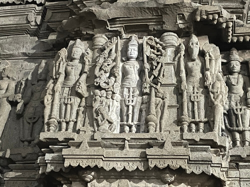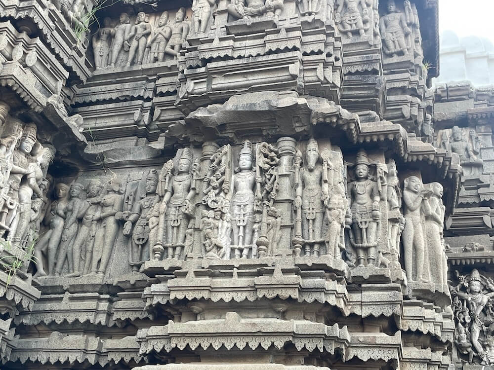 मंदिराच्या बाह्य भिंतींवर आणि स्तंभांवर केलेले कोरीव काम अतिशय सुबक, गुंतागुंतीचे आणि वैशिष्ट्यपूर्ण आहे. मंदिराच्या अधिष्ठानावर अखंड काळ्या पाषाणात कोरलेले गजथर, अश्वथर आणि नरथर आहेत. याशिवाय भिंतींवर दशावतारातील विविध प्रसंगांचे चित्रण, रामायण आणि महाभारतातील कथा,