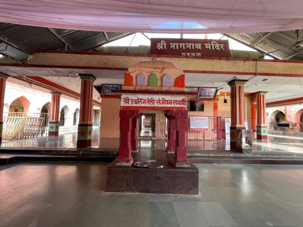 दुमजली असलेल्या या प्रवेशद्वाराच्या वरच्या मजल्यावर नगारखाना आहे. तीन पायऱ्या चढून या प्रवेशद्वारातून मंदिराच्या प्रांगणात प्रवेश होतो. पायऱ्यांच्या दोन्ही बाजूला कठडे आहेत. प्रांगणात तटबंदीच्या आतील बाजूस सर्वत्र ओवऱ्या आहेत. प्रवेशद्वारापासून मुख्य मंदिरापर्यंत मोठा मंडप आहे. भाविकांच्या सोयीसाठी त्यावर पत्याचे छत टाकलेले आहे. या मंडपात एका चौथऱ्यावर एकलिंग तेली संजिवन समाधी आहे. त्यापुढे खुला सभामंडप, अंतराळ व गर्भगृह अशी मंदिराची संरचना आहे. खुल्या स्वरूपाच्या सभामंडपातील खांबांवर छताचा भार आहे. त्यापुढे अंतराळाचे प्रवेशद्वार आहे. या प्रवेशद्वाराच्या वर छताकडील बाजूस अनेक देवीदेवतांच्या प्रतिमा आहेत. या मंदिराचे प्रवेशद्वार पूर्वाभिमुख असले तरी गर्भगृह दक्षिणाभिमुख आहे. गर्भगृहाच्या द्वारशाखा पितळी पत्र्याने मढविलेल्या आहेत. या प्रवेशद्वाराच्या दोन्ही बाजूला द्वारपाल व ललाटबिंबस्थानी गणपतीची मूर्ती आहे. गर्भगृहातील वज्रपिठावर नागनाथ महाराजांच्या दोन मूर्ती आहेत. भाविकांमध्ये त्यांना थोरला देव आणि धाकटा देव असे संबोधिले जाते. दोन्ही मूर्तींवर चांदीचे मुकूट व पितळी मुखवटे आहेत. असे सांगितले जाते की याच गर्भगृहात नागनाथांनी अवतार कार्य संपविण्यापूर्वी आपले उजवे पाऊल येथे उमटवले होते. या मंदिर परिसरात संतकवी उद्धव चिंद्धन यांची संजिवन समाधी, बापुजी महाराज आणि धनगर देशमुखाची ओवरी, गुरुगादी, धानम्मादेवीचे मंदिर आदी स्थाने आहेत.