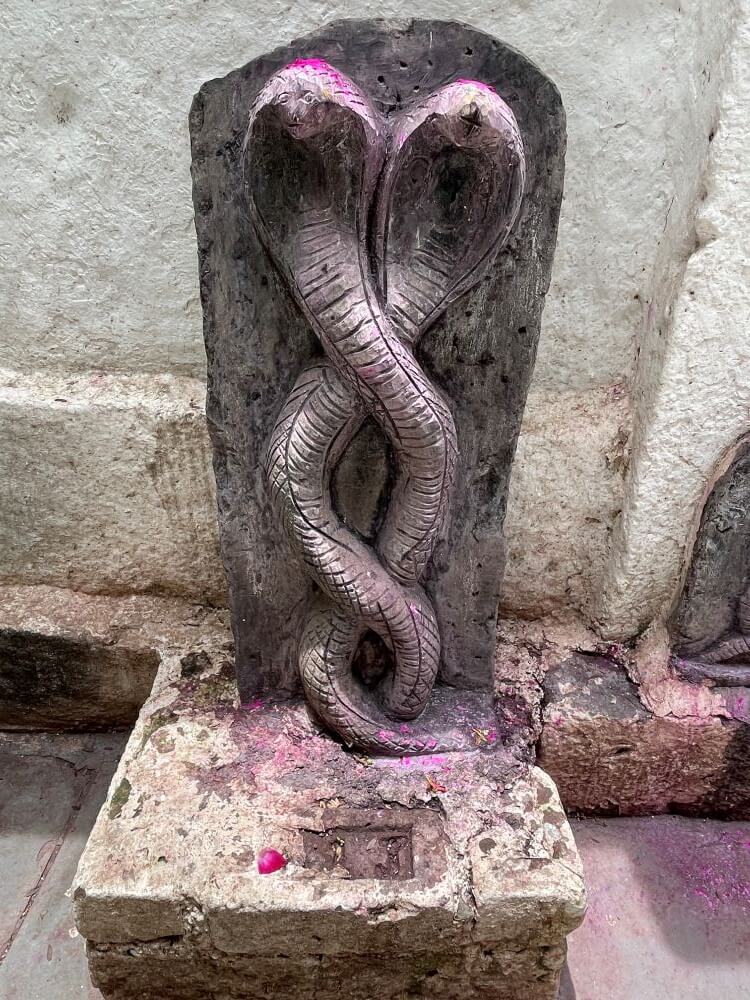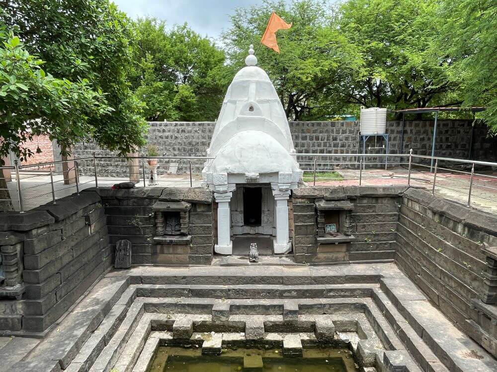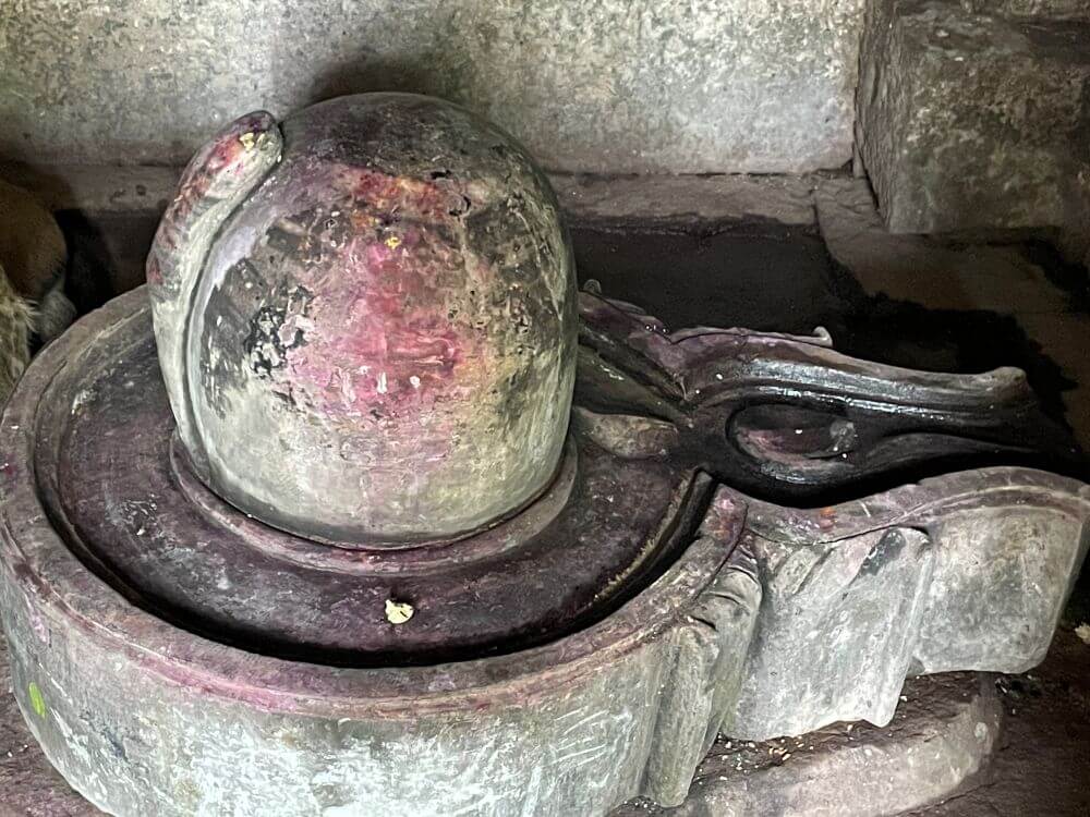 गर्भगृहात शंकराची पिंडी आहे. त्यामागील चौथऱ्यावर शंकराचा मुखवटा आहे. गर्भगृहावर साधेसे शिखर आणि वर कळस आहे. शेजारी आणखी एक लहानसे शिवमंदिर असून त्याचा दरवाजा म्हणजे मुख्य मंदिराच्या दरवाजाची प्रतिकृती दिसते. या मंदिरात असलेल्या पिंडीवरही नागप्रतिमा कोरलेली दिसते.