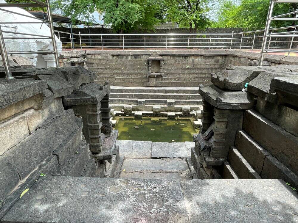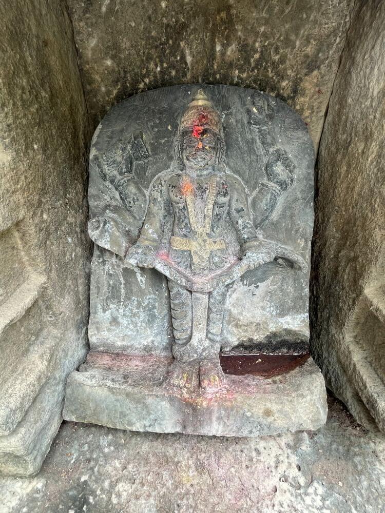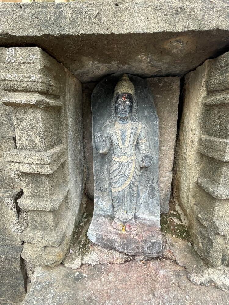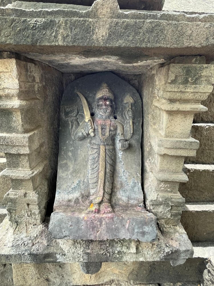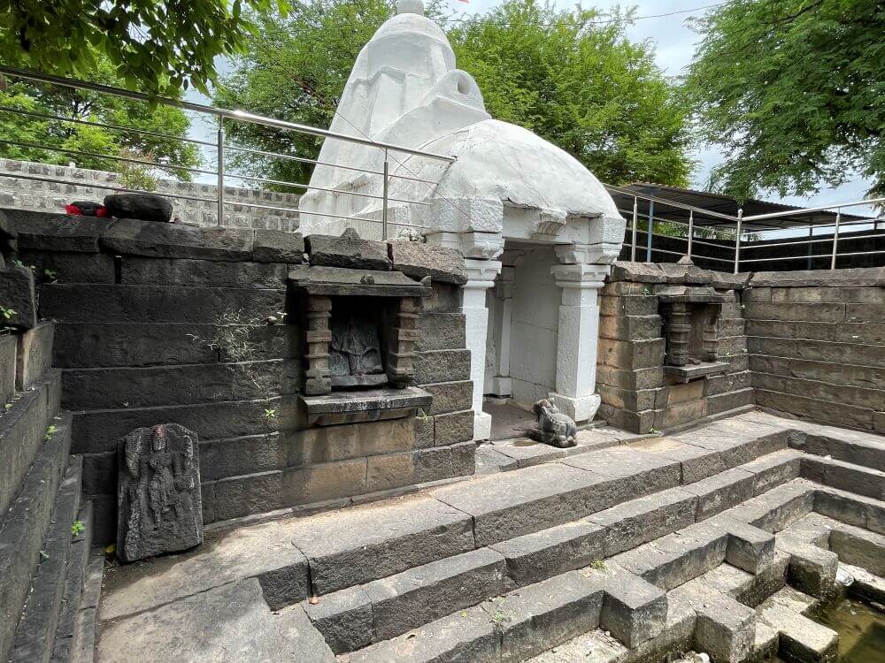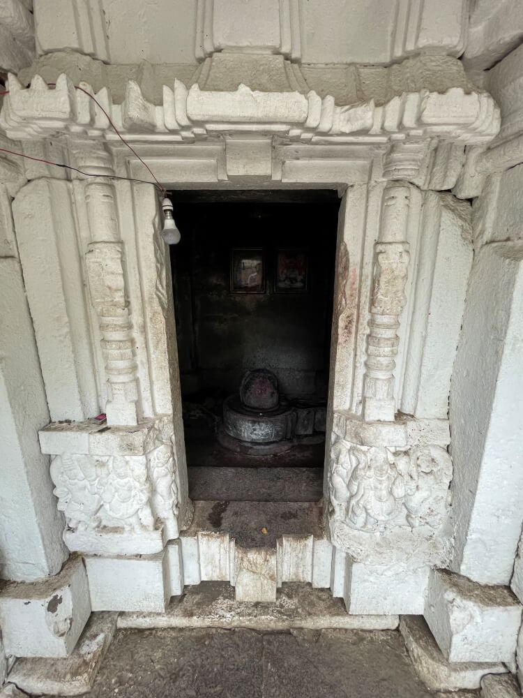 मंदिरात प्रवेश करण्यासाठी असलेल्या दरवाजाजवळ नागयुगुलांच्या दगडी कोरीव प्रतिमा आहेत. मंदिराच्या दरवाजाच्या दोन्ही बाजूला स्वागतिका, द्वारपाल आणि यक्ष प्रतिमा कोरलेल्या आहेत. त्या प्रतिमांच्या वर नक्षीदार स्तंभशाखा आहे. मंदिराच्या गुढमंडपात मध्यभागी कासव आणि नंदीच्या मूर्ती आहेत. गर्भगृहाच्या प्रवेशद्वाराच्या डावीकडे एक शंकर पार्वतीची मूर्ती आहे. ही मूर्तीची काहीशी झिज झाली असली तरी नंदीवर बसलेल्या शंकर पार्वतीच्या अंगावरील दागिने, त्यांच्या हातातील वस्तू स्पष्ट दिसतात. शंकराच्या मांडीवर गणपती, तर पार्वतीच्या हातात षडानन म्हणजेच कार्तिकेयाची मूर्ती आहे.
