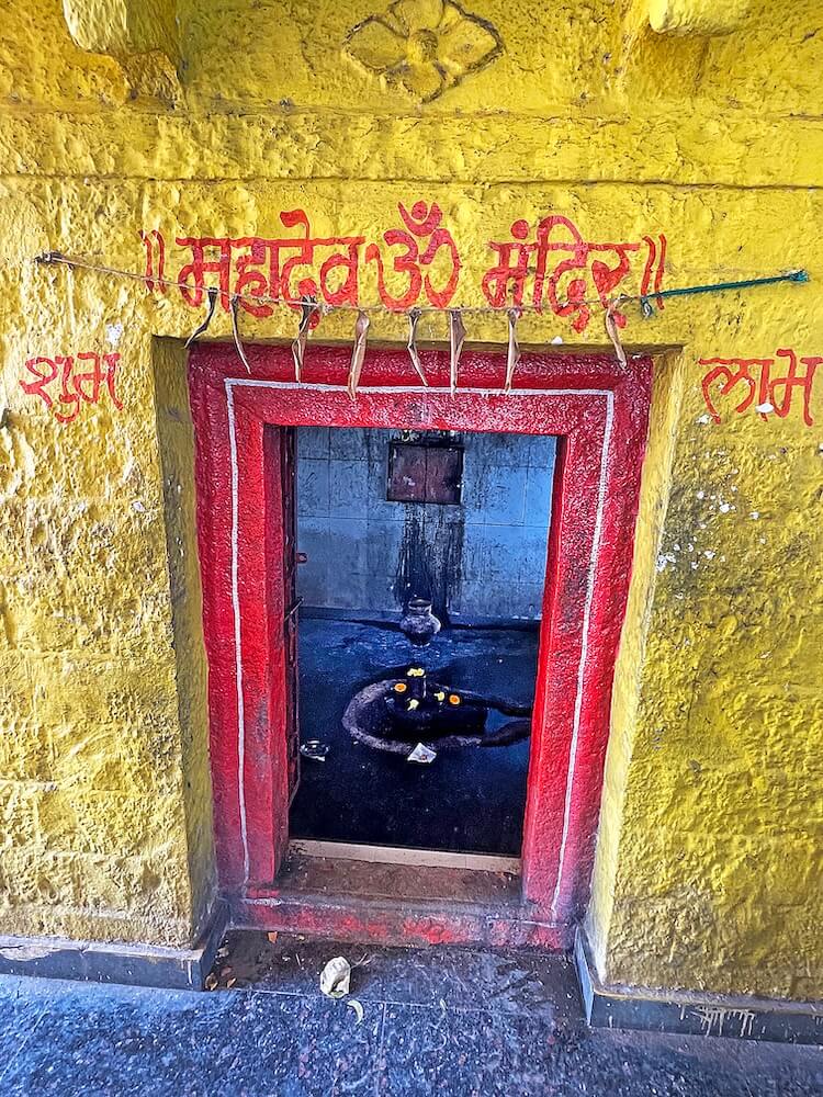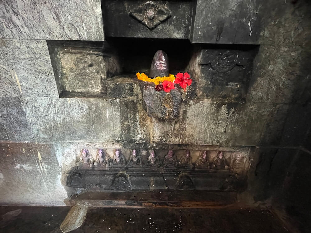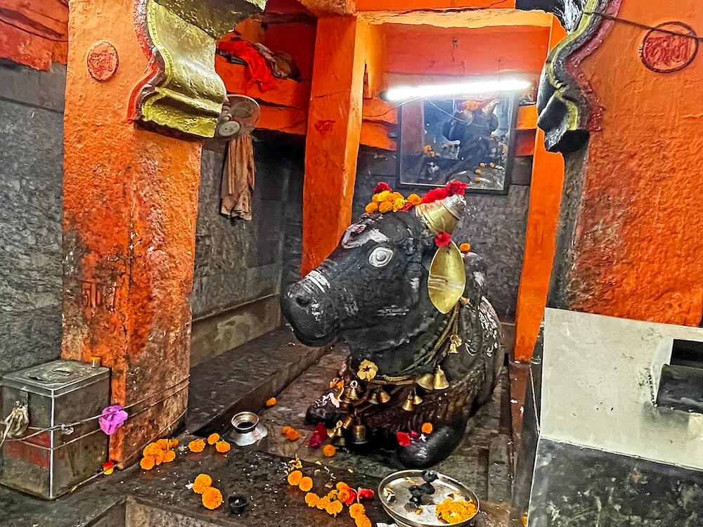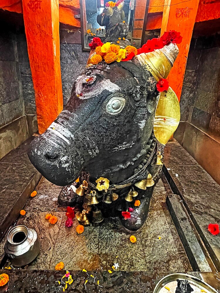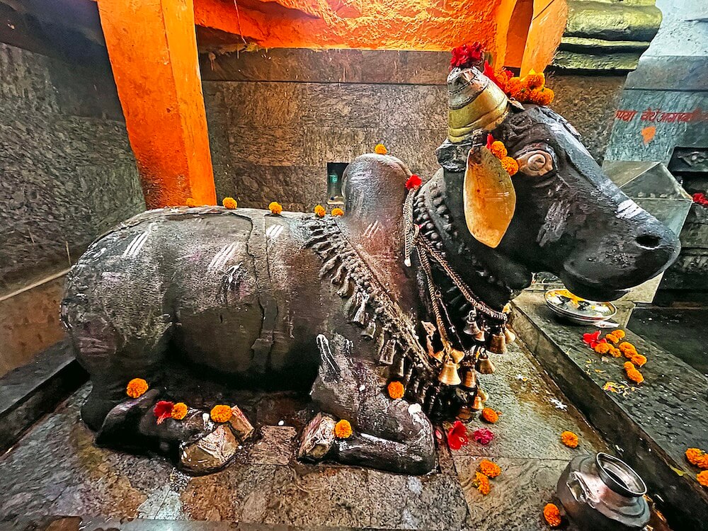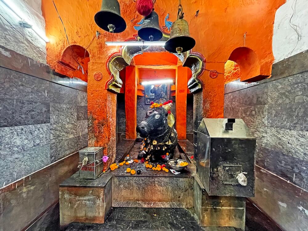 त्यामुळे गर्भगृहात जाण्यासाठी व गर्भगृहातून बाहेर पडण्यासाठी स्वतंत्र मार्ग तयार झाले आहेत. पुढे गर्भगृहाचे प्रवेशद्वार आहे. या प्रवेशद्वाराच्या द्वारशाखांवर पानाफुलांची नक्षी व ललाटबिंबावर एक अस्पष्ट शिल्प आहे. गर्भगृहात वज्रपीठावर नंदीची काळ्या पाषाणातील मूर्ती आहे. या विशाल मूर्तीच्या अंगावर झूल, गळ्यात माळा व इतर आभूषणे अत्यंत कलात्मक पद्धतीने कोरलेली आहेत. नंदीच्या शिंगांना चांदीच्या शिंगोळ्या बसवल्या आहेत आणि कान व डोळे देखील चांदीचे आहेत. नंदीच्या कपाळावर त्रिपुंड व आडव्या पट्टया नक्षीने कोरलेल्या आहेत. पाठीवरील वशिंड शिवपिंडीच्या आकाराचे आहे.