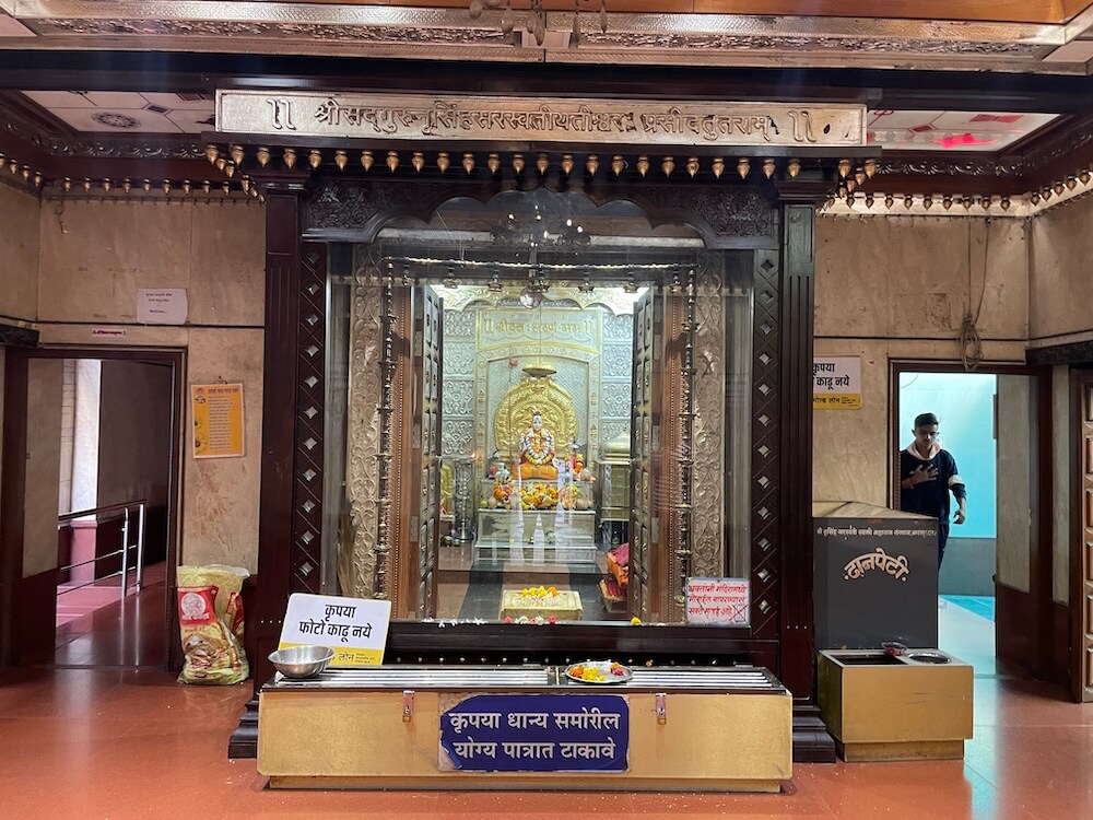 अंतराळात प्रदक्षिणा मार्ग सोडून गर्भगृहाची रचना आहे. गर्भगृहाच्या प्रवेशद्वारावर चांदीचे नक्षीकाम आहे. गर्भगृहात सोनेरी रंगाच्या अधिष्ठानावर बालस्वरूपातील नृसिंह सरस्वतींची शुभ्र संगमरवरी मूर्ती आहे. गणपती आणि श्रीदत्त यांच्याही मूर्ती येथे आहेत. येथील सर्व कार्यक्रम गाणगापूरच्या मठाप्रमाणे चालतात. पहाटे पाच वाजता काकड आरती होते. सकाळी आठ ते साडेआठ वाजेपर्यंत निर्गुण पादुकांना गंधलेपन केले जाते. दुपारी साडेबारा वाजता आरती व त्यानंतर आलेल्या भाविकांना महाप्रसाद दिला जातो. रात्री साडेनऊ वाजेपर्यंत भाविकांना येथे दर्शन घेता येते. दर गुरुवारी येथे स्वामींची पालखी काढली जाते. याशिवाय गुढीपाडवा, आषाढ शुक्ल प्रथमेला वासुदेवानंद सरस्वती पुण्यतिथी, श्रावण वद्य पंचमीला वासुदेवानंद सरस्वती यांची जयंती, भाद्रपद शुक्ल चतुर्थीला श्रीपाद श्रीवल्लभ जयंती, मार्गशीर्ष शुद्ध दशमीला ब्रह्मानंद सरस्वती यांची पुण्यतिथी, पौष शुक्ल द्वितेयाला नृसिंह सरस्वती जयंती हे उत्सव येथे मोठ्या उत्साहात साजरे केले जातात.