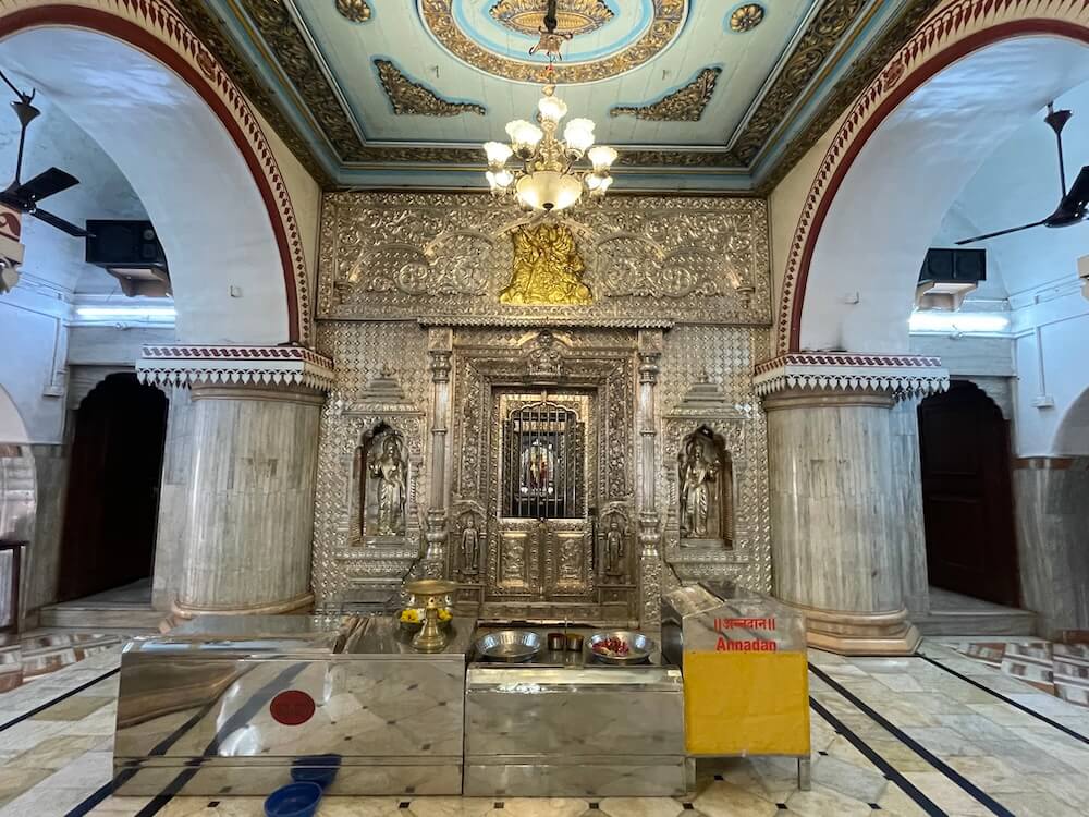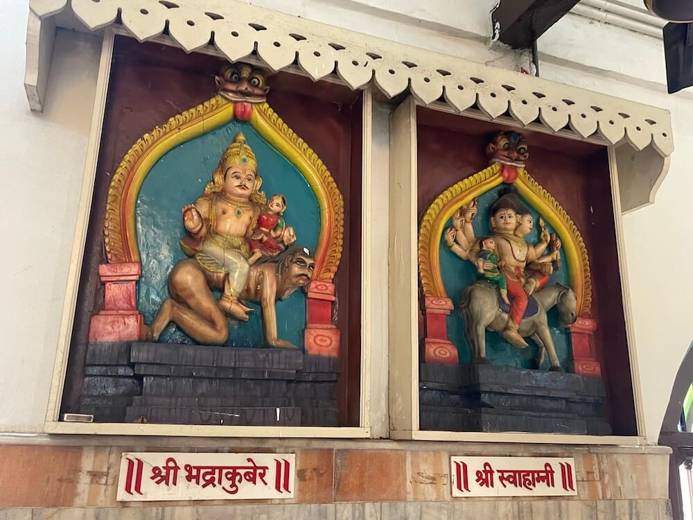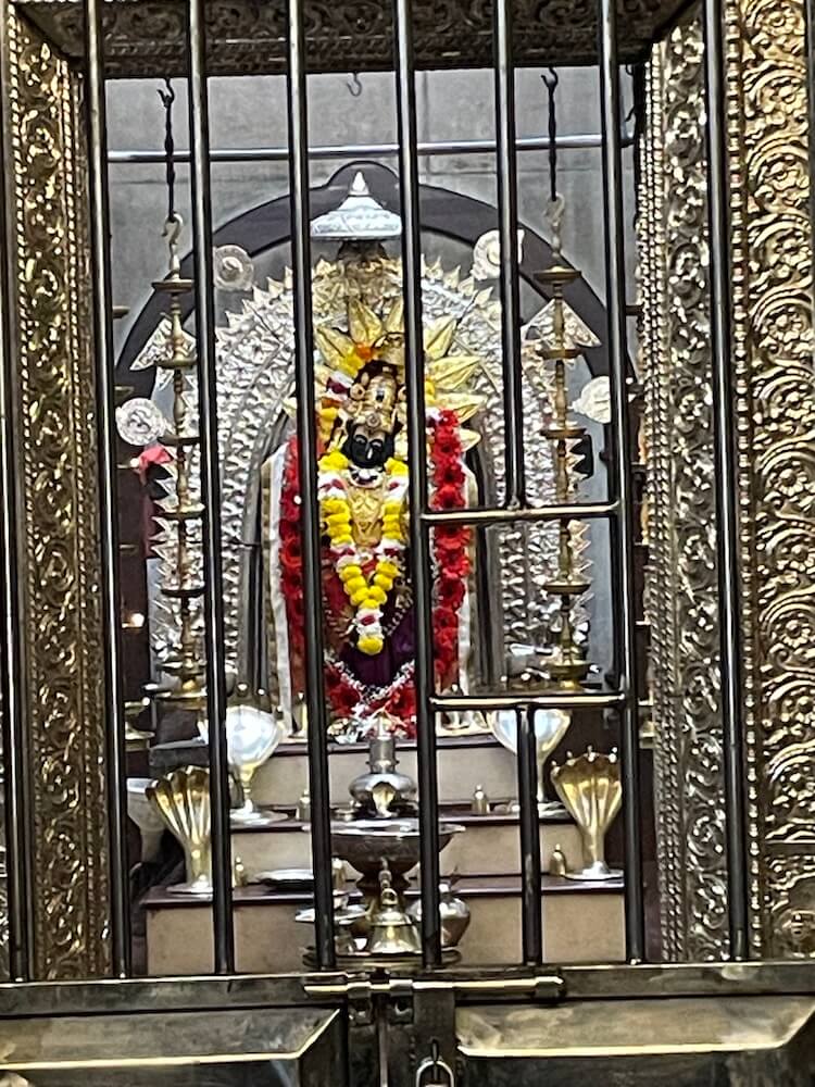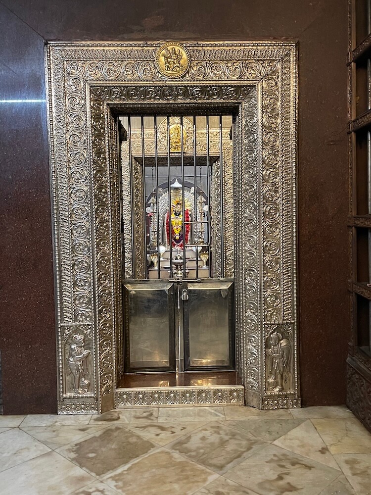गर्भगृहाचे प्रवेशद्वार अंतराळापेक्षा उंचावर असल्यामुळे प्रवेशद्वारास दोन पायऱ्या आहेत. गर्भगृहाच्या दर्शनी भिंती चांदीच्या पत्र्याने मढविलेल्या आहेत. प्रवेशद्वाराच्या दोन्ही बाजूच्या देवकोष्टकांत द्वारपाल शिल्पे व द्वारशाखांवर पानाफुलांच्या नक्षी आहेत. ललाटबिंबावर महिषासुरमर्दिनीची मूर्ती आहे. द्वारशाखांवर खालील बाजूस द्वारपाल शिल्पे आहेत. गर्भगृहात वज्रपिठावर नवदुर्गा देवीची महिषासुरमर्दिनी स्वरूपातील शाळीग्राम पाषाणातील चतुर्भुज मूर्ती आहे. देवीने महिषासुराच्या देहावर पाय ठेवला असून त्रिशूल व तलवारीने त्याच्यावर वार केलेला आहे. देवीच्या एका हातात पानपात्र आहे. देवी दुसऱ्या हाताने महिषासुराच्या देहातून देवदेह खेचून बाहेर काढीत आहे.