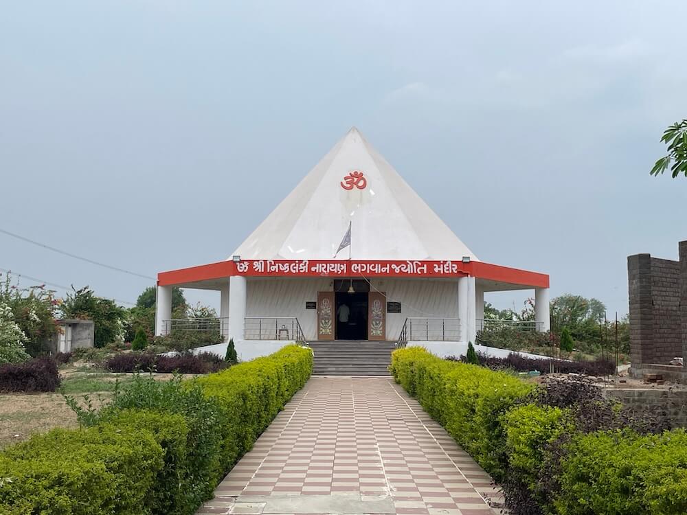 To the right of the samadhi temple, at a short distance, lies the Nishkalanki Narayan Jyoti Mandir, dedicated to the central deity of the Satpanth tradition. It is believed that Nishkalanki Narayan’s original name was Murtaza Ali, the son-in-law of Prophet Muhammad, but within the Satpanth, he is venerated in a Hindu form. Built on a high circular platform, the temple features a dome shaped like a pyramid topped with the sacred symbol of Om. Eleven steps lead up to the sabhamandap, where a platform holds Nishkalanki Narayan’s symbolic gadi (seat), with a sword and a brass Om affixed. His padukas rest before it on a smaller platform. To the left stands the marble Deepstambh, where the Adishakti Jyot burns continuously. Behind the seat, images of Lord Vishnu and the trinity of Brahma-Vishnu-Mahesh are placed.