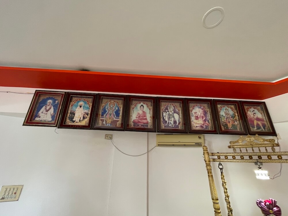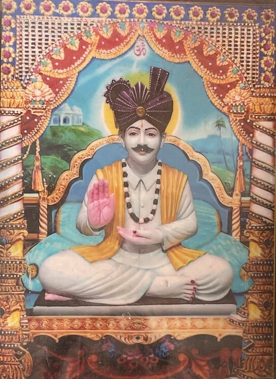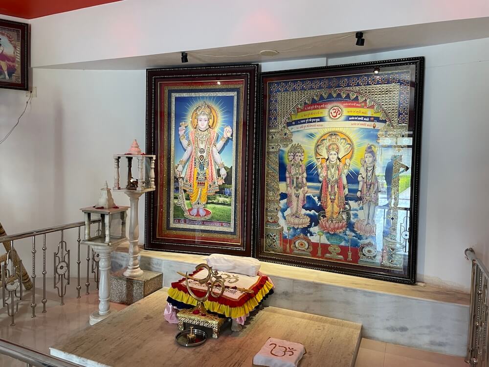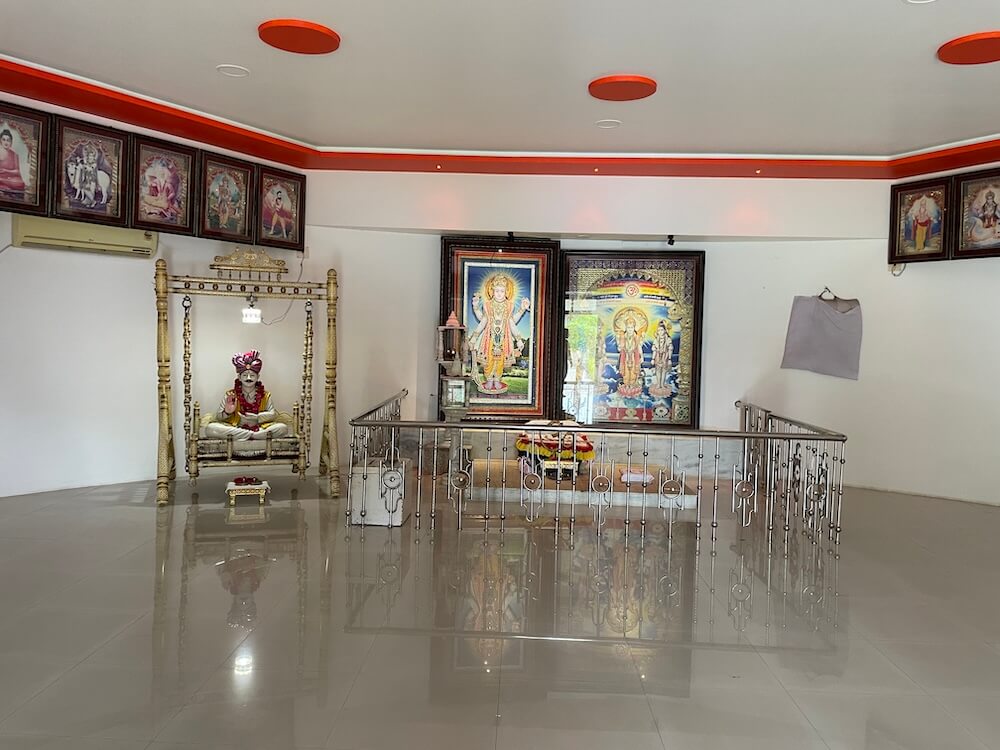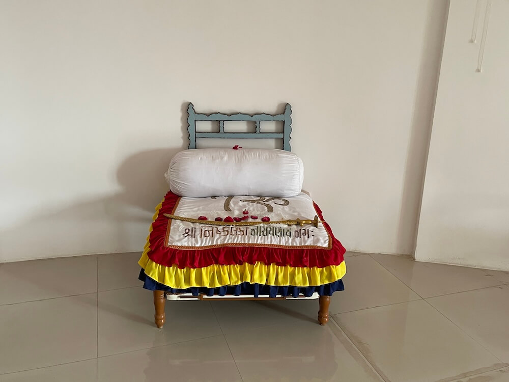 Within the sabhamandap a beautiful swing holds a marble statue of Nayaji Maharaj seated cross-legged in a blessing posture, with his padukas placed nearby. Along the walls are images of Lord Vishnu’s ten avatars, as well as portraits of Sage Ved Vyasa, Saint Tulsibapa and Guru Imam Shah Maharaj.