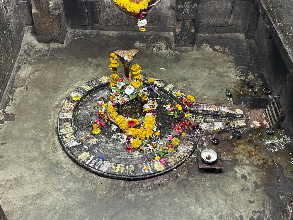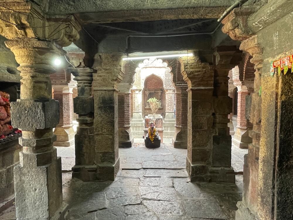 उजवीकडील मुख्य गर्भगृहाच्या प्रवेशद्वाराजवळ एका चौथऱ्यावर अखंड पाषाणातील नंदीची मूर्ती आहे. गर्भगृहासमोर असलेल्या अंतराळातून चार पायऱ्या उतरून गर्भगृहात प्रवेश होतो. या गर्भगृहाच्या द्वारपट्टीच्या मध्यभागी असलेल्या ललाटबिंबावर गणेशाचे शिल्प आहे. गर्भगृहात जमिनीवर मोठ्या शाळुंकेमध्ये शिवपिंडी आहे. शिवपिंडीवर पितळी नागाने छत्र धरले आहे व त्याच्या वरील बाजूस छताला अभिषेक पात्र टांगलेले आहे. या दगडी गर्भगृहाच्या वितानावर सुंदर शिल्पे कोरलेली आहेत. या गर्भगृहासमोर प्रांगणात असलेल्या चौथऱ्यावर नंदीची दगडी मूर्ती आहे. या मंदिरातील एका दगडी स्तंभावर शिलालेख आहे. येथील एका देवकोष्टकामध्ये गणेशाची शेंदूरचर्चित मूर्ती आहे.