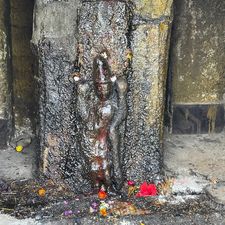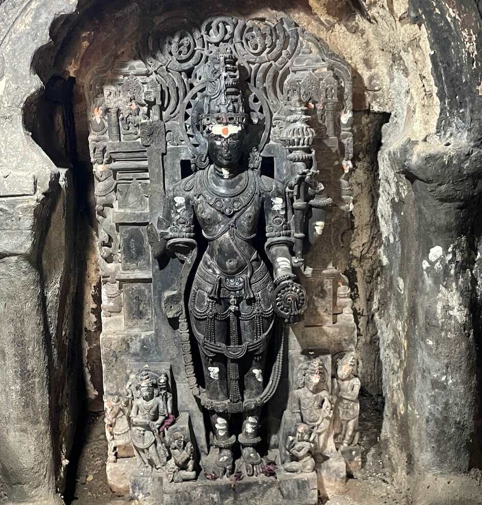 मूर्तीच्या उजव्या चरणाजवळ नंदी आणि डाव्या चरणाजवळ गरुड कोरलेला आहे. असे सांगितले जाते की या चतुर्भुज मूर्तीच्या कपाळावर पूर्वी हिरा होता. परकीय आक्रमणादरम्यान हा हिरा चोरण्यात आला आणि तो काढण्याच्या प्रयत्नात ही मूर्ती थोडी खंडित झाली. त्यामुळे तिच्या कपाळावर लहानसा खड्डा पडल्याचेही सांगण्यात येते.