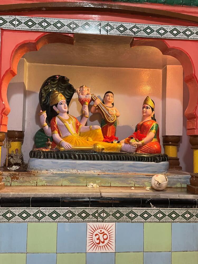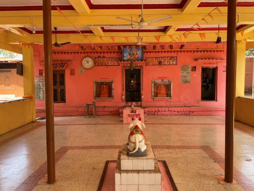 विराजमान असलेल्या शंकर–पार्वतीचेही शिल्प आहे. डावीकडील गर्भगृहात शेषशायी विष्णू व लक्ष्मीची, तर उजवीकडे विठ्ठल–रुक्मिणीची मूर्ती विराजमान आहे. मधल्या गर्भगृहाचे प्रवेशद्वार दगडी बांधकामाचे आहे. द्वारचौकटीवर पाना–फुलांची नक्षी कोरलेली आहे व खालच्या बाजूस द्वारपालांच्या मूर्ती आहेत. द्वारचौकटीच्या मंडारकावर अर्धचंद्रशीला व दोन्ही बाजूंना किर्तीमुखे कोरलेली आहेत. त्यासमोर दगडात कोरलेली नक्षी आहे. त्यात शंखाची शुभचिन्हेही कोरलेली आहेत. आत भूतलावर खोलगट भागात ओंकारेश्वर महादेवाची पिंडी प्रतिष्ठापित आहे. गर्भगृहाच्या मागच्या भिंतीतील देवळीत पार्वतीची सुबक मूर्ती आहे. येथे एका कोपऱ्यात महादेवाचा पंचधातूचा मोठा मुखवटा ठेवलेला आहे.