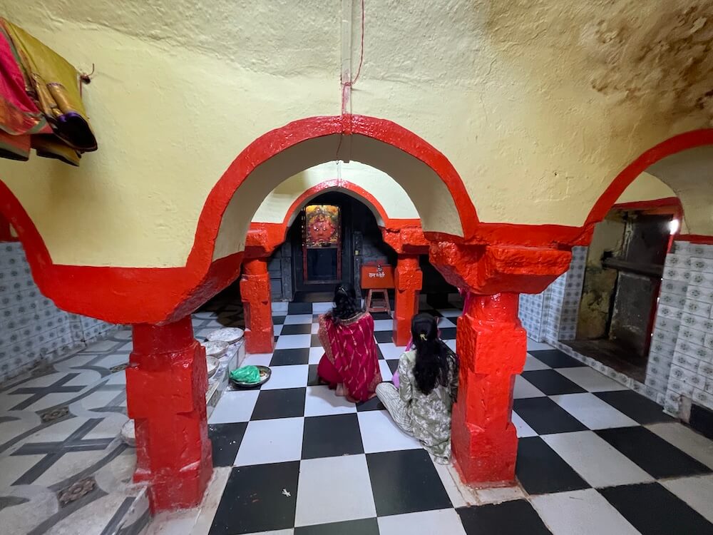 पुढे लहानसे अंतराळ व त्यापुढे गर्भगृहाचे प्रवेशद्वार आहे. गर्भगृहाच्या दर्शनी भिंतीवर स्तंभनक्षी आहे. प्रवेशद्वाराच्या द्वारशाखांवर पाना-फुलांची नक्षी आहे. ललाटबिंबावर गणपती शिल्प आहे. मंडारकावर चक्र कोरलेले आहे. प्रवेशद्वारास नक्षीदार लाकडी झडपा आहेत. गर्भगृहात वज्रपीठावर नक्षीदार पाषाणी मखर आहे. मखरात चार नक्षीदार स्तंभ व त्यावर घुमटाकार शिखर आहे. मखरात देवीचा स्वयंभू तांदळा आहे. देवीची बिंदी व नेत्र चांदीचे आहेत. तसेच डोक्यावर चांदीचा मुकुट आहे. मूर्तीच्या मागील चांदीच्या प्रभावळीत वर कीर्तीमुख असलेले मयूर तोरण आहे. मूर्तीच्या समोर चांदीच्या पादुका आहेत. वज्रपीठावर उजव्या बाजूला देवीचा पितळी मुखवटा आहे. डाव्या बाजूला आणखी एक मखर व त्यात मूर्ती आहे.