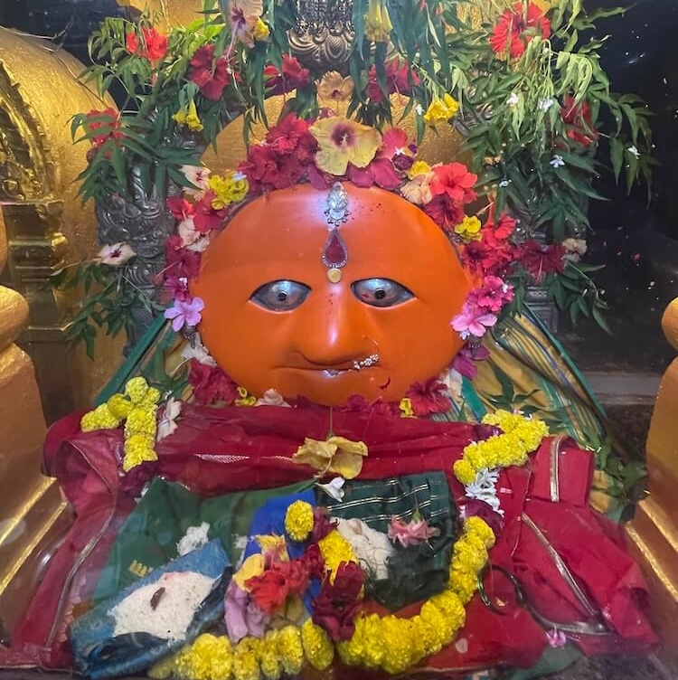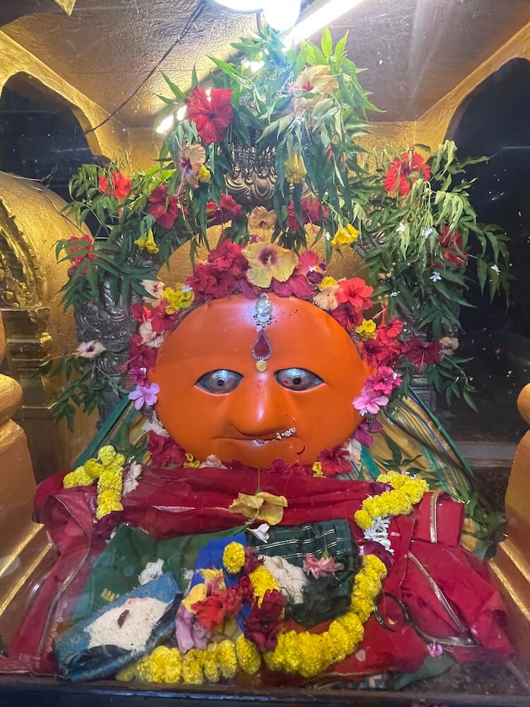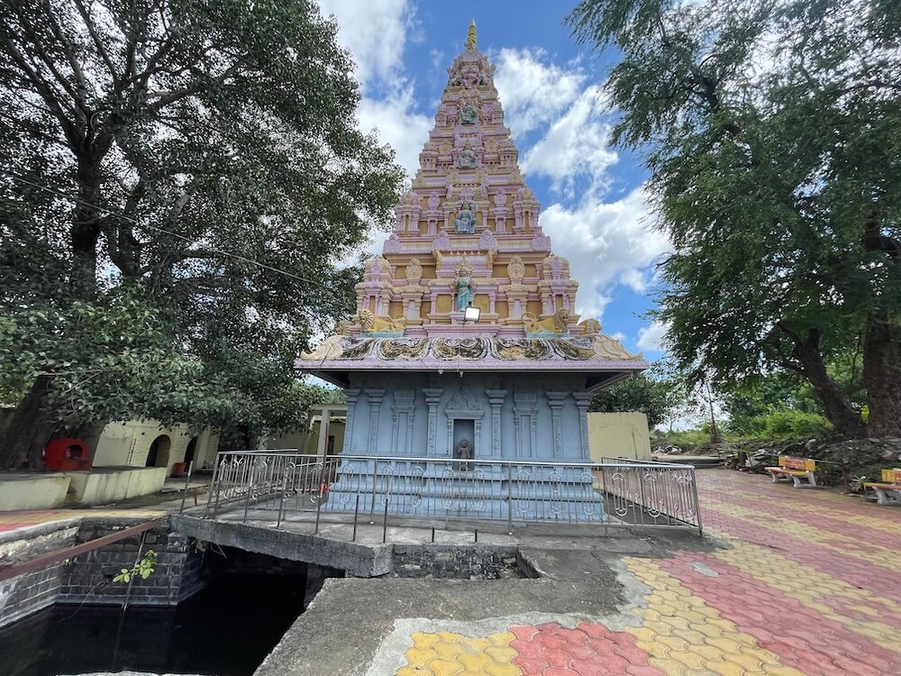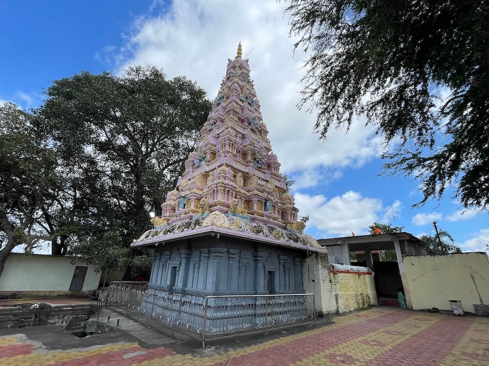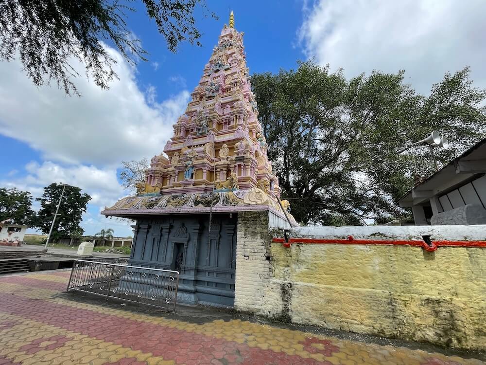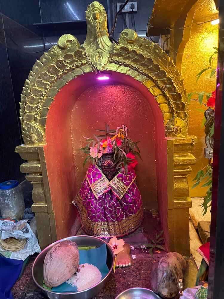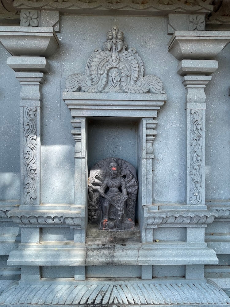देवीने महिषासुराच्या अंगावर पाय ठेवून भाल्याचा प्रहार केला आहे. एका हातात महिषासुराचे शीर धरलेले आहे. गर्भगृहाच्या छतावर पाच थरांचे द्रविडी शैलीतील चौकोनी शिखर आहे. शिखराच्या प्रत्येक थरात शाल व कूट रचना आहेत. शिखराच्या चारही बाजूंनी सिंह शिल्पे आहेत. प्रत्येक थरात चारही दिशांना विविध देवतांच्या मूर्ती आहेत. शिखराच्या शीर्षभागी स्तूपिका असून त्यावर कळस आहे. मंदिराच्या बाह्य बाजूने प्रदक्षिणा मार्ग आहे. प्रदक्षिणा मार्गाच्या बाह्य बाजूला लोखंडी सुरक्षा कठडा आहे.