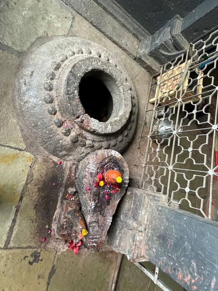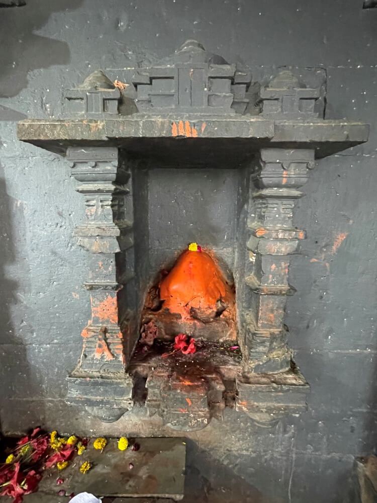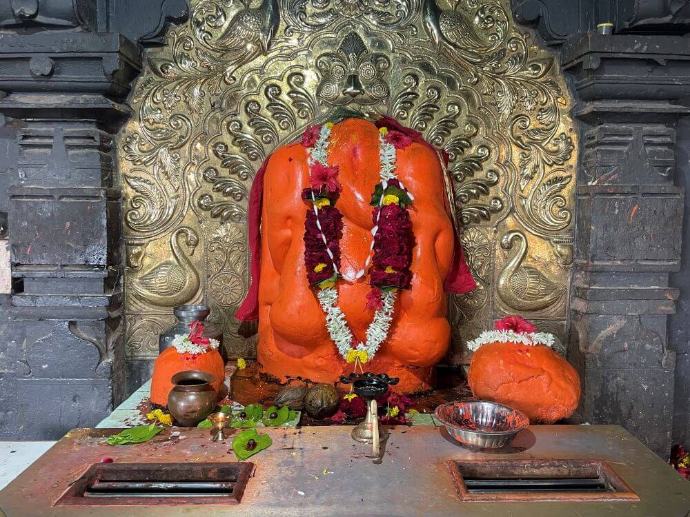 अंतराळातील लहान प्रवेशद्वारातून गर्भगृहात प्रवेश होतो. गर्भगृहातील वज्रपिठावर गणपतीची मूर्ती स्थित आहे. मूर्तीच्यामागे असलेल्या धातूच्या प्रभावळीवर वैशिष्ट्यपूर्ण नक्षीकाम आहे. याच प्रभावळीत गणपतीच्या दोन्ही बाजूला हंस व मयूर कोरलेले आहेत. मूर्तीच्या दोन्ही बाजूला असलेल्या दोन शेंदूरचर्चित शिळा या रिद्धी-सिद्धी असल्याचे सांगितले जाते. मंडपात काही देवकोष्टके आणि काही देवळ्या आहेत. गणपती मूर्तीच्या डावीकडील देवकोष्टकात मारुतीची मूर्ती व उजवीकडे अर्ध्याहून जास्त जमिनीत असलेला रांजण आहे. रांजणाला लागूनच एक शिवपिंडीही आहे. मंदिराच्या गर्भगृहावर असलेल्या शिखरावरही अनेक शिल्पे कोरलेली आहेत.
