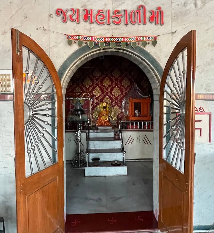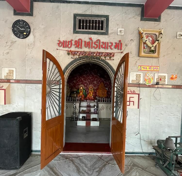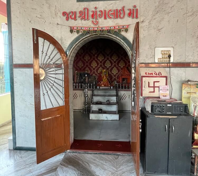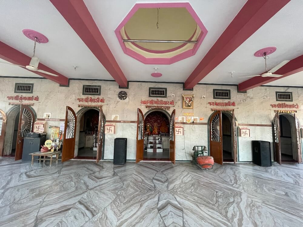 The Sabhamandap, which features large windows, is floored entirely with marble. A statue of a lion, the Vahana (divine vehicle) of the Goddess, sits upon a pedestal. Directly ahead, the five deities reside within their respective Garbhagrihas. In the sanctum on the far right is Sindwai Mata, also known as Siddheshwari Mata, the Kuladevata of the Bachatar Gotra. Beside her is Mahakali Mata, the ancestral deity of the Godar Gotra. Adjacent to this is the sanctum of Khodiyar Mata, the deity of the Daharka Gotra. This sanctum also contains an idol of Sikotar Mata. In the next chamber resides Meldi Mata, the guest Kuladevata of the Pichatar Gotra. The leftmost sanctum is home to Munglai Devi (Mogal Mata). Munglai Devi is the original ancestral deity of the Pichatar Gotra. She is also referred to as Brahmini Devi in certain places.