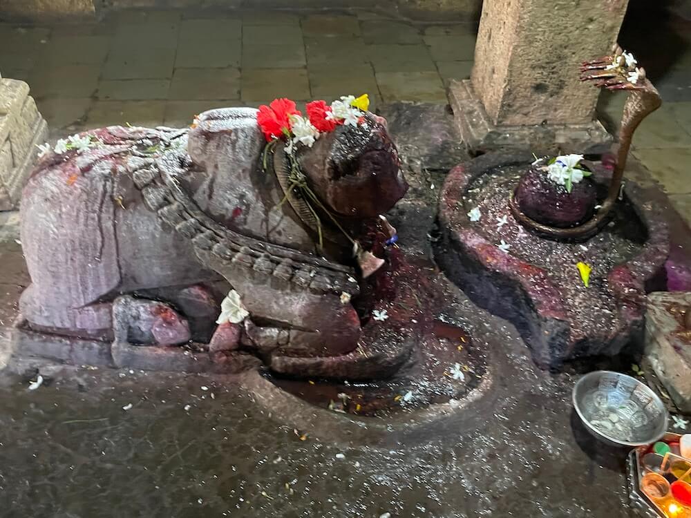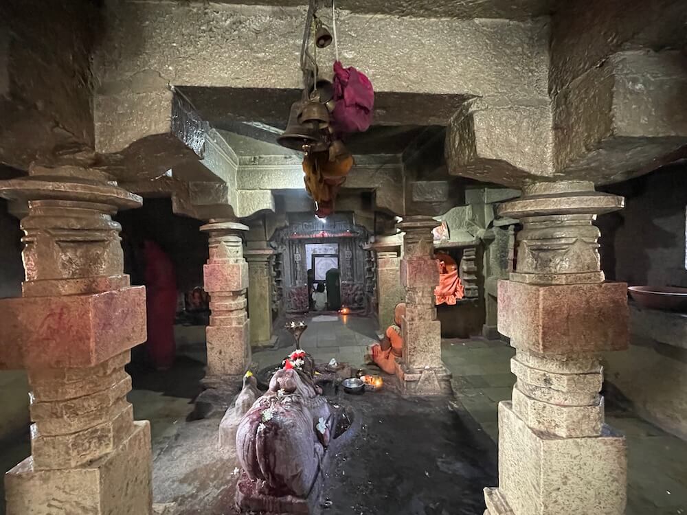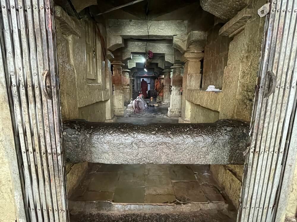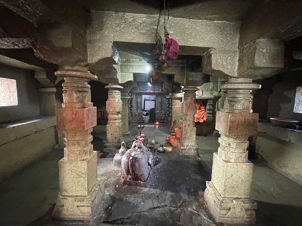 सर्व देवकोष्ठकांत दोन्ही बाजूला नक्षीदार वामन स्तंभ आहेत. त्यावर नक्षीदार तोरणे आहेत. गर्भगृहाच्या प्रवेशद्वाराच्या द्वारशाखांवर खालील बाजूला द्वारपाल व द्वारपालिका शिल्पे आहेत, तर वर पद्मपुष्प व स्तंभनक्षी आहे. ललाटबिंबावर गणपती शिल्प व उत्तरांगावर शिखरशिल्पांचे तोरण आहे. गर्भगृहात जमिनीवर मध्यभागी शिवपिंडी आहे. शिवपिंडीवर छत्र धरलेला पितळी नाग आहे आणि जलधारा धरलेले तांब्याचे अभिषेक पात्र छताला टांगले आहे. बंदिस्त स्वरूपाच्या गर्भगृहात चारही कोपऱ्यांत चार नक्षीदार स्तंभ आहेत. येथील अष्टकोनी वितानावर चक्राकार नक्षी आहे.