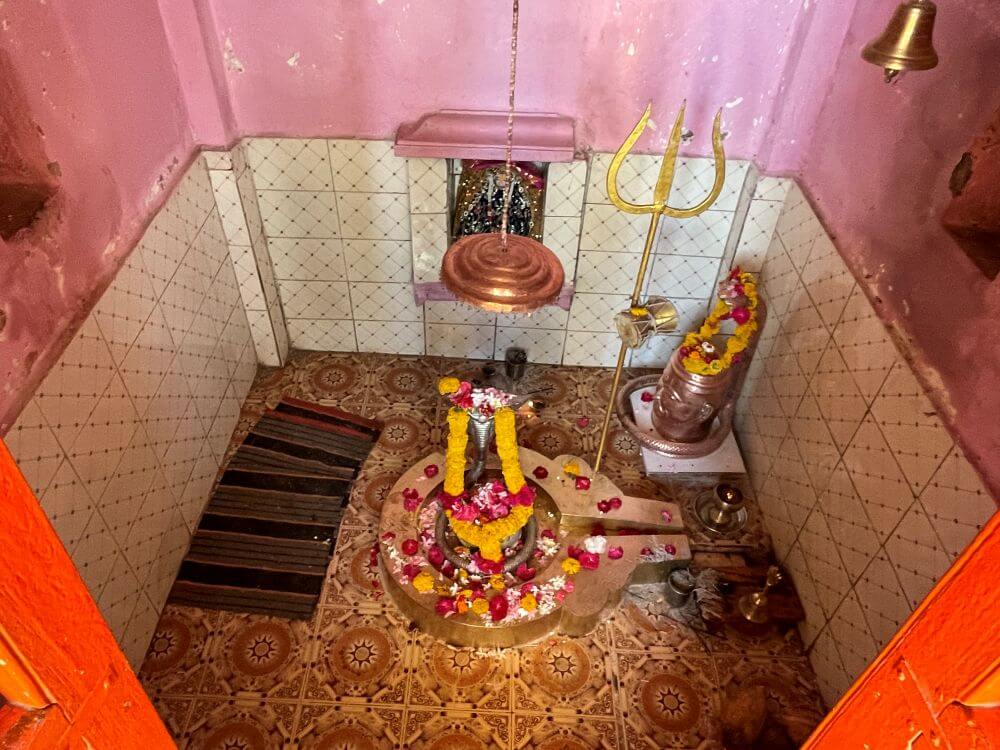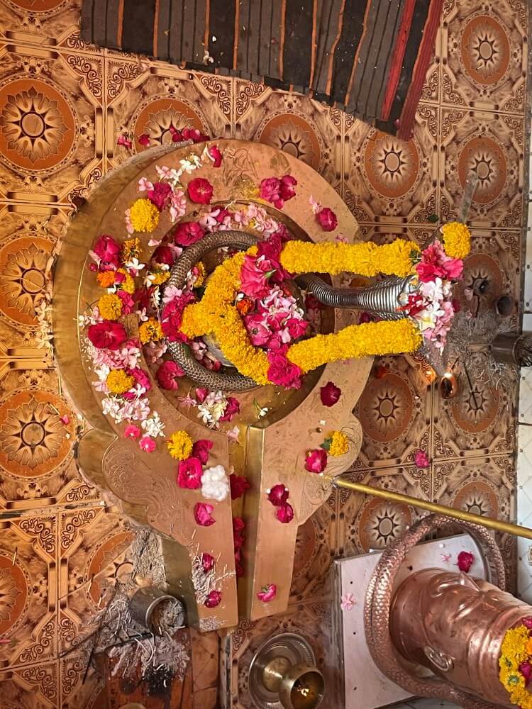 The main temple features attractive spires and smaller decorative spires (Upashikhara). The temple comprises an assembly hall (Sabhamandap), vestibule (Antarala) and the inner sanctum (Garbhagriha). Within the assembly hall is a statue of Nandi. The vestibule has shrines of Ganesha on the left and Hanuman on the right. A few steps descend into the sanctum, where a Shivling is centrally located, sheltered by a silver serpent canopy. Nearby is a Shiv mask and the sanctum’s walls display an image of Mount Kailash. Behind the Shivling is a statue of Goddess Parvati.
