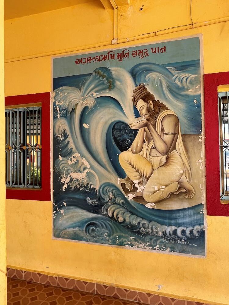 To the temple’s right side, there is an ashram for pilgrims undertaking the Narmada Parikrama. Beautiful wall paintings depict Goddess Narmada, the story of Agastya drinking the ocean, Shiv and Annapurna Mata, among other narratives. Food arrangements for pilgrims are available at the Annapurna Bhavan here, along with a small dharmashala (guesthouse). Many pilgrims visit this place, especially during the month of Chaitra and the month of Shravan. Kartiki Chaturdashi is celebrated here with special festivities.
