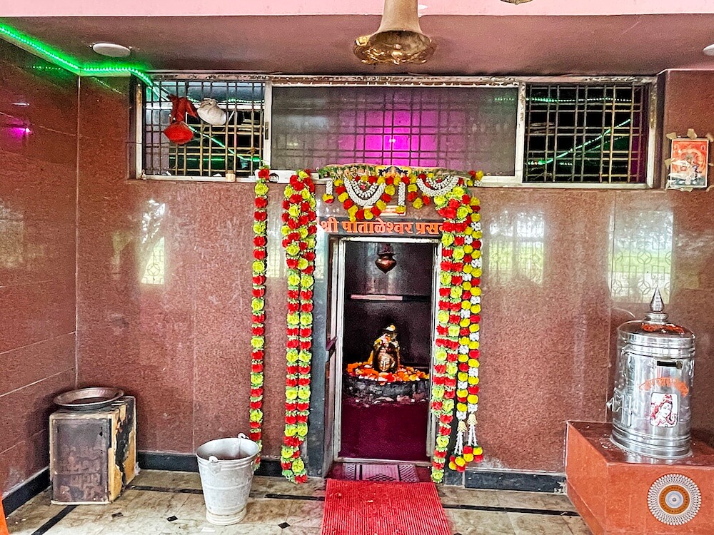 नंदीमंडपापासून सुमारे वीस फूट अंतरावर पाताळेश्वर महादेवाचे मंदिर आहे. मंदिराच्या चारही बाजूंनी सुमारे सहा फूट रुंद व तीन फूट उंच चौथरा आहे. चौथऱ्याच्या सभोवताली लोखंडी स्तंभ व त्यांवर सिमेंट पत्र्यांचे छत आहे. चौथऱ्यावर चढण्यासाठी चार पायऱ्या आहेत. पुढे सभामंडपाचे प्रवेशद्वार आहे. बंदिस्त स्वरूपाच्या सभामंडपात उजेड व हवा येण्यासाठी खिडक्या व गवाक्षे आहेत. सभामंडपात गर्भगृहाच्या दोन्ही बाजूला दोन कक्ष आहेत. यांचा वापर भांडारगृह म्हणून केला जातो.