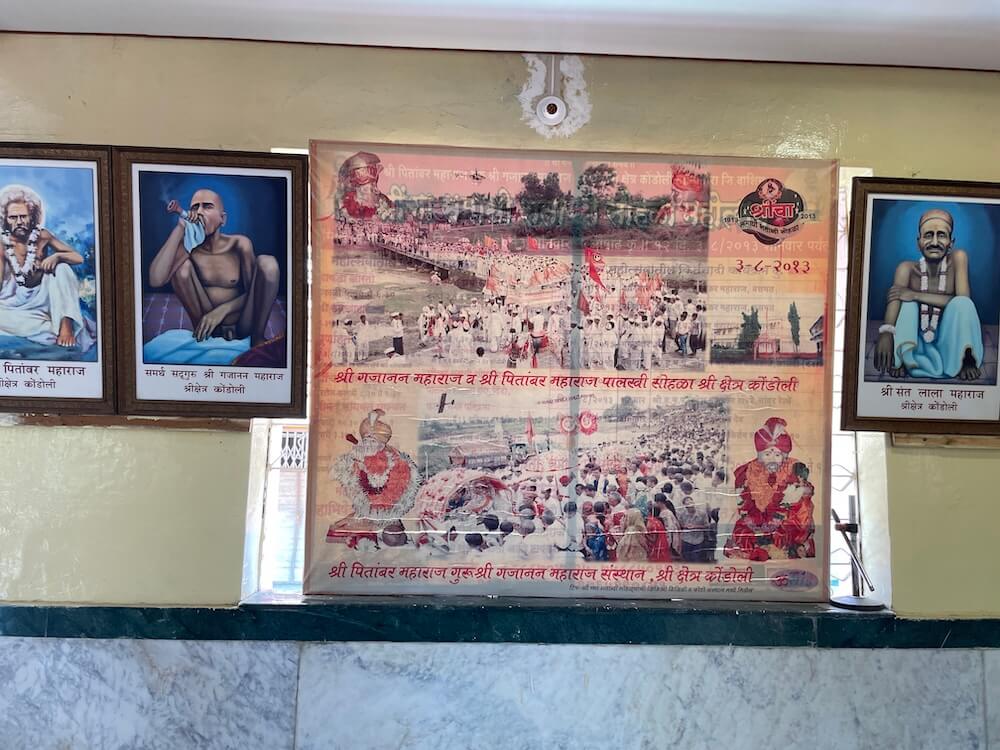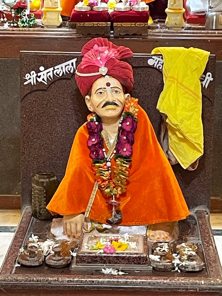गर्भगृहाच्या दर्शनी भिंतीवर प्रवेशद्वाराच्या दोन्ही बाजूला हाती गदा घेतलेली द्वारपाल शिल्पे आहेत. या शिल्पांच्या वरील बाजूस दीपकोष्ठके आहेत. प्रवेशद्वाराच्या द्वारशाखेवर पाना-फुलांची नक्षी व ललाटबिंबावर गणपतीची मूर्ती आहे. गर्भगृहात जमिनीवर मध्यभागी असलेल्या चौकोनी वज्रपीठावर लाला महाराज यांची मूर्ती आहे. या मूर्तीच्या मागील भिंतीत असलेल्या वज्रपीठावर गणपती, संत ज्ञानेश्वर, गजानन महाराज, संत तुकाराम, विठ्ठल-रुक्मिणी यांच्या मूर्ती आहेत. मंदिराच्या प्रांगणात संत पितांबर महाराज सभागृह, तसेच संस्थानच्या कार्यालयाची मोठी इमारत आहे. सभागृहासमोर एका चौथऱ्यावर संत गजानन महाराज यांची मूर्ती प्रतिष्ठापित आहे.