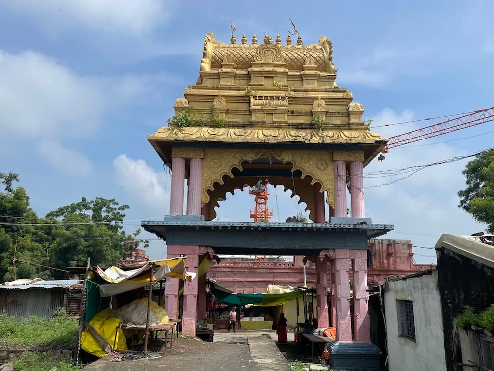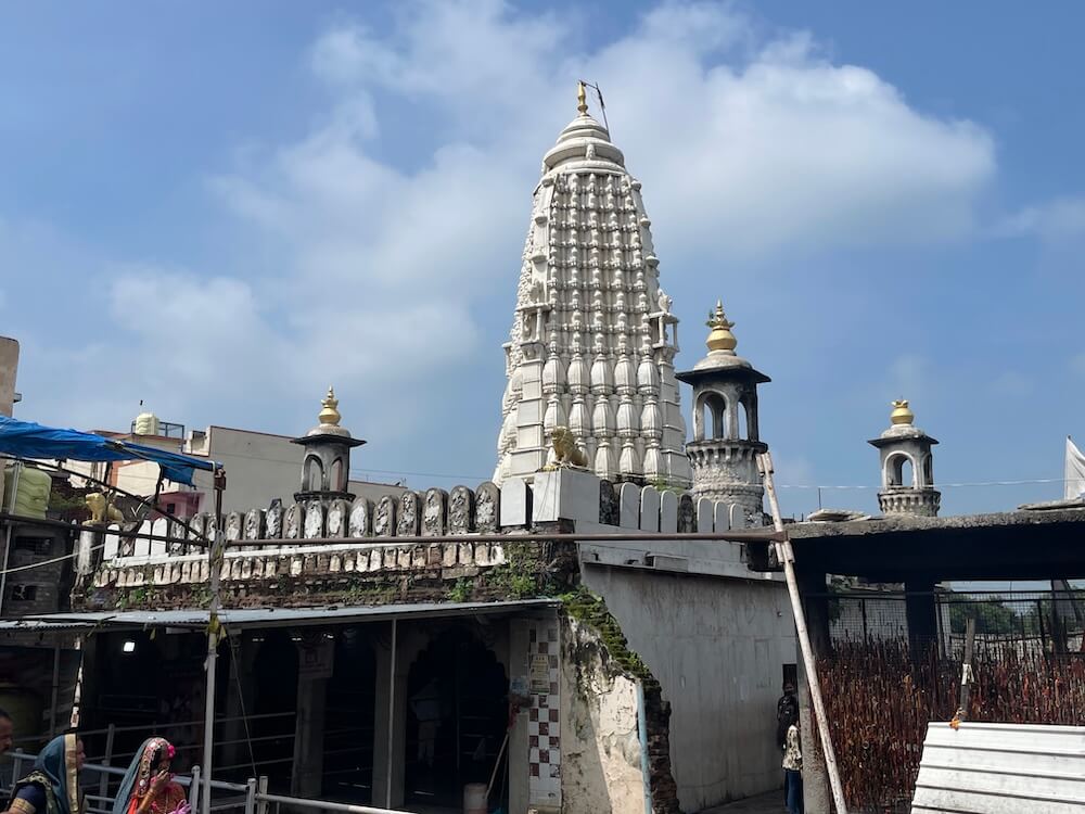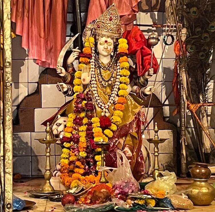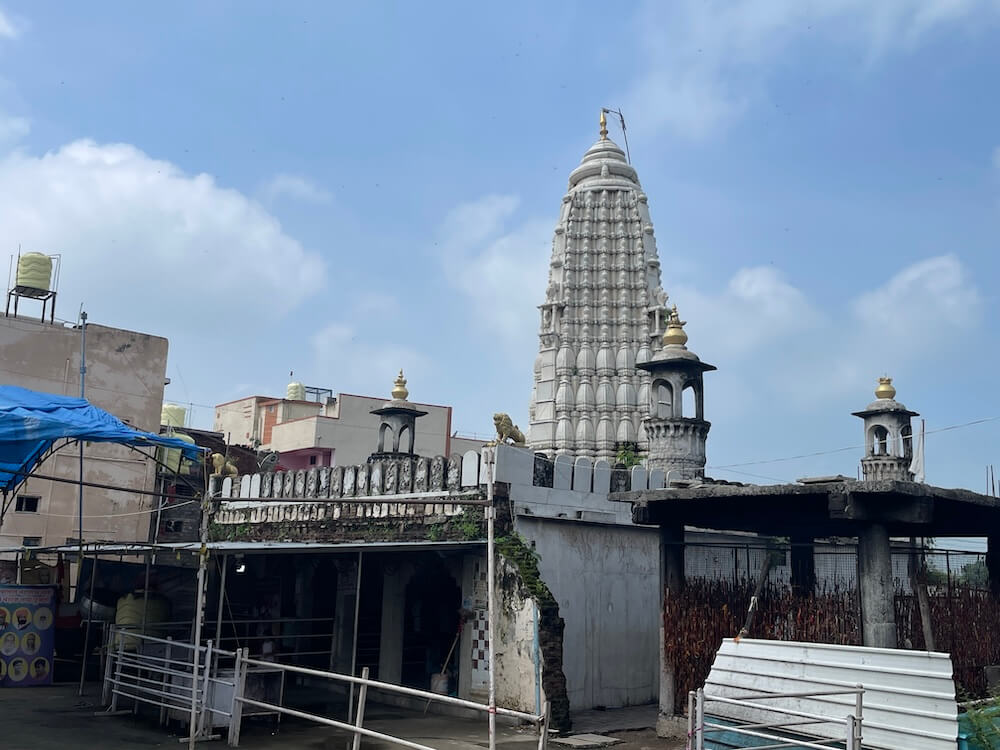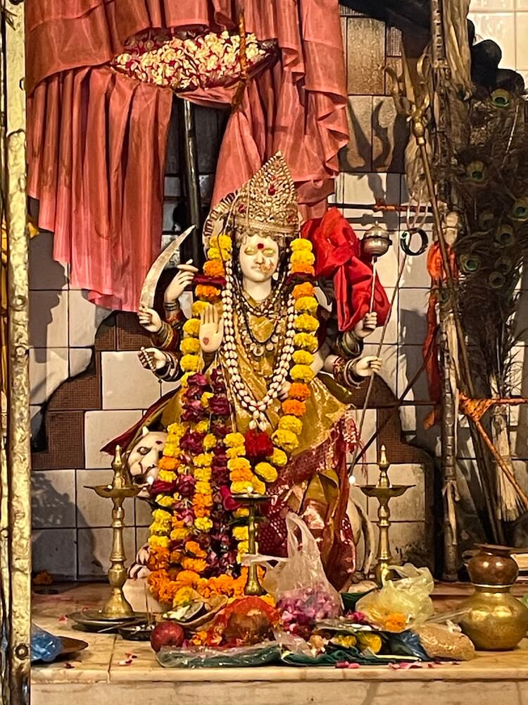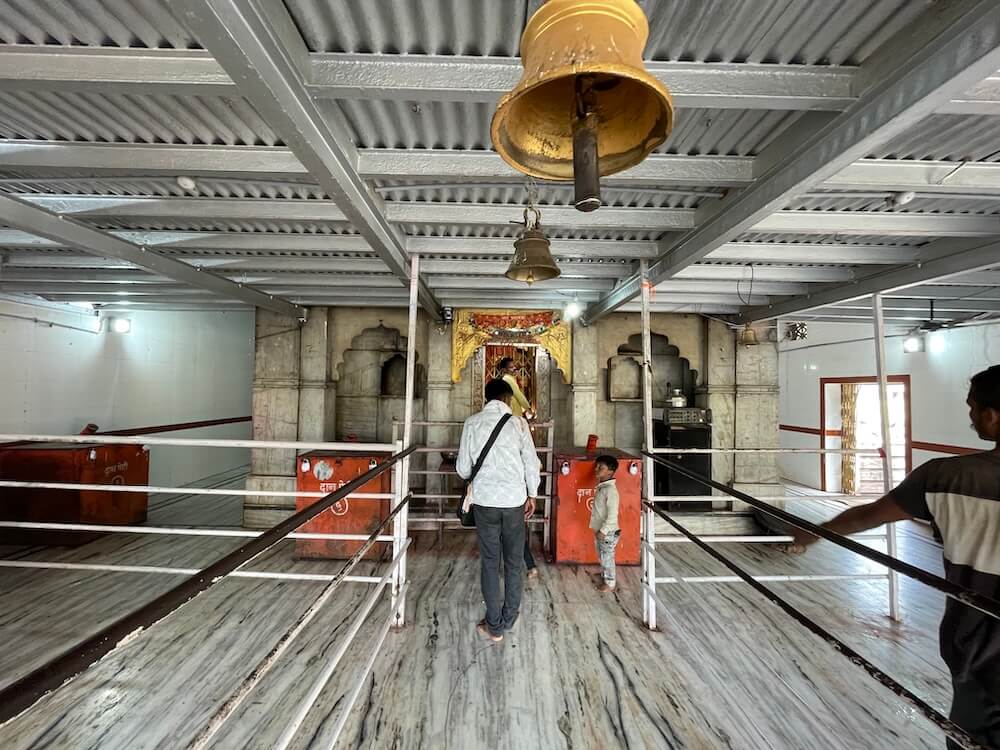 सभामंडपावरील छतास बाशिंगी कठडा असून त्याच्या चारही कोपऱ्यांत जगदंबा मातेचे वाहन असलेल्या सिंहाच्या मूर्ती आहेत. सभामंडप समोरून खुल्या स्वरूपाचा आहे. अंतराळाच्या प्रवेशद्वारास सुवर्णरंगी महिरपी कमान आहे. समोरच गर्भगृह आहे. आत संगमरवरी वज्रपीठावर अष्टभुजा व्याघ्रारूढ जगदंबेची संगमरवरी मूर्ती प्रतिष्ठापित आहे. वस्त्रालंकारांनी, कवड्यांच्या आणि फुलांच्या माळांनी शृंगारलेल्या या देवीच्या मस्तकी मुकूट आहे. देवीने हातात शंख, चक्र, खड्ग आदी आयुधे धारण केलेली आहेत. गर्भगृहावर उंचच उंच शिखर आहे. हे शिखर नागर शैलीतील उरुशृंग पद्धतीचे आहे. त्यावर चक्राकार आमलक आणि कळस आहे. या शिखराच्या चारही बाजूंना छोट्या मेघडंबऱ्यांसारखी रचना आहे.